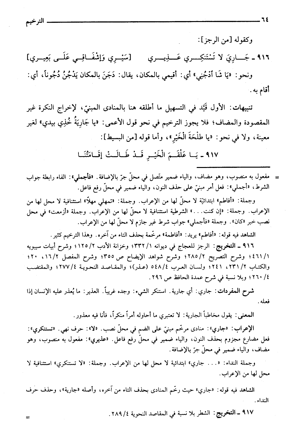 الشاهد فيه قوله: "جاري" حيث رخم المنادى بحذف التاء من آخره، وأصله "جارية" وحذف حرف النداء.