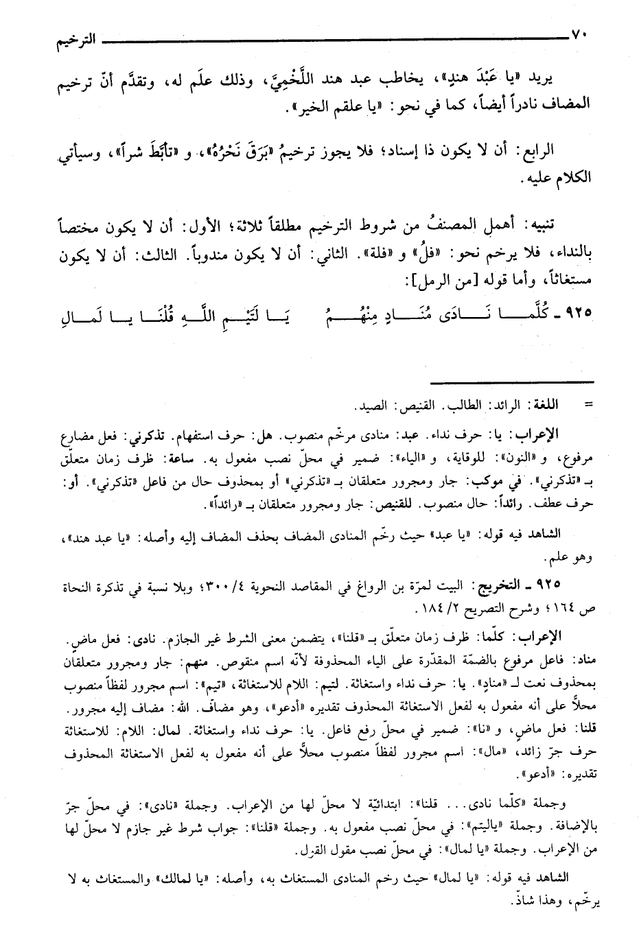 يريد "يا عبد هند"، يخاطب عبد هند اللخمي وذلك علم له، وتقدم أن ترخيم المضاف نادر أيضًا كما في نحو: "يا علقم الخير".