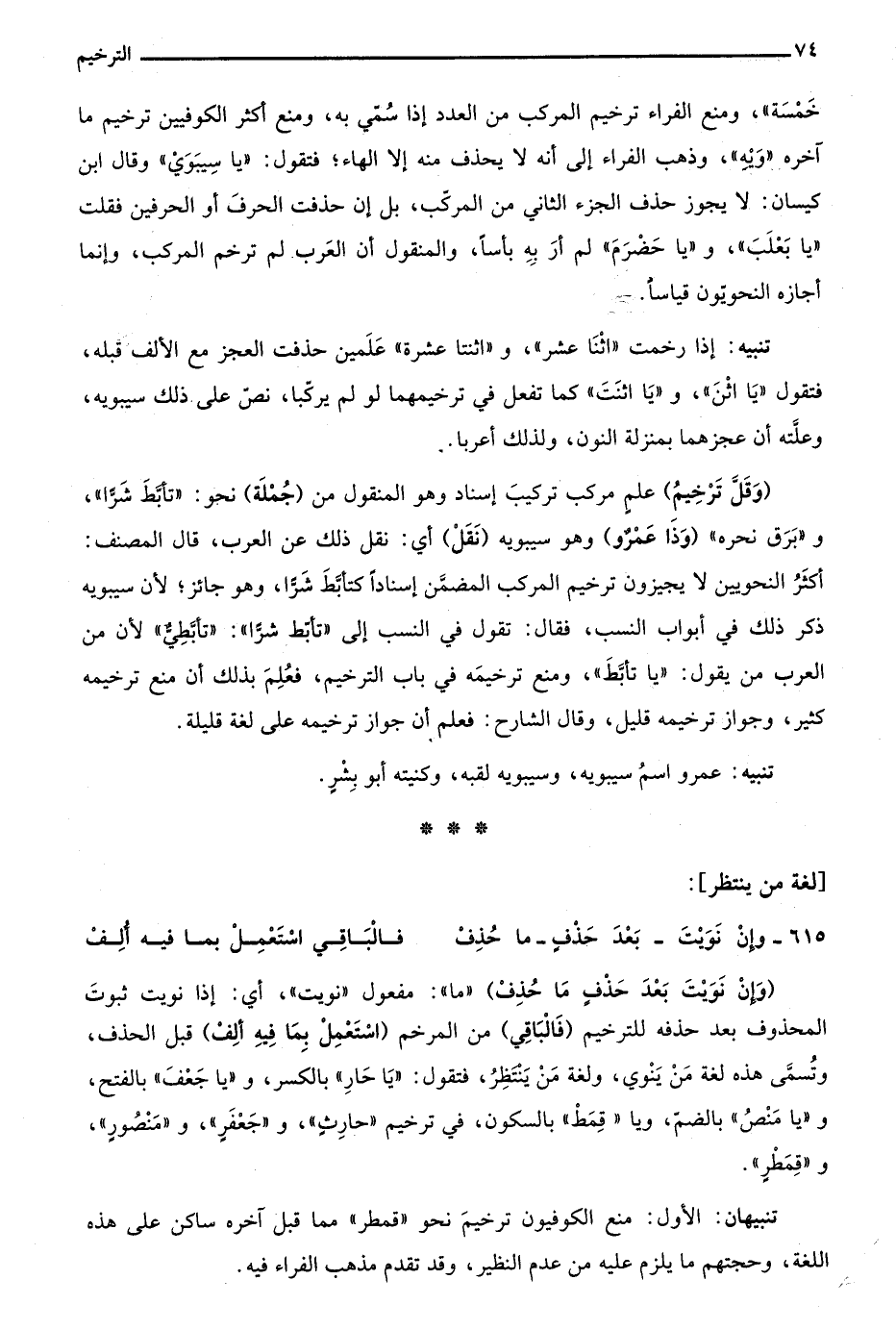 خمسة"، ومنع الفراء ترخيم المركب من العدد إذا سمي به، ومنع أكثر الكوفيين ترخيم ما آخره "ويه"، وذهب الفراء إلى أنه لا يحذف منه إلا الهاء؛ فتقول: "يا سيبوي"، وقال ابن كيسان لا يجوز حذف الجزء الثاني من المركب بل إن حذفت الحرف أو الحرفين فقلت: "يا بعلب" و"يا حضرم" لم أرَ به بأسًا، والمنقول أن العرب لم ترخم المركب وإنما أجازه النحويون قياسًا.