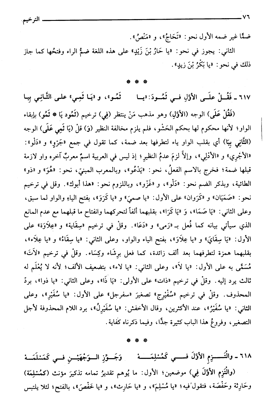 "فَقُل عَلَى" الوجه "الأَوَّلِ" وهو مذهب من ينتظر "فِي" ترخيم "ثَمُودَ يا ثَمُو" بإبقاء الواو لأنها محكوم لها بحكم الحشو فلم يلزم مخالفة النظير "وَ" قل "يَا ثَمِي عَلَى" الوجه "الثَّانِي بِيَا" أي بقلب الواو ياء لتطرفها بعد ضمة كما تقول في جمع "جرو" و"دلو": "الأجري" و"الأدلي"، وإلا لزم عدم النظير؛ إذ ليس في العربية اسم معرب آخره واو لازمة قبلها ضمة فخرج بالاسم الفعل نحو: "يدعو"، وبالمعرب المبني، نحو: "هو" و"ذو" الطائية، وبذكر الضم نحو: "دلو" و"غزو"، وباللزوم نحو: "هذا أبوك"، وقل في ترخيم نحو: "صميان" و"كروان" على الأول: "يا صمي" و"يا كرو" بفتح الياء والواو لما سبق، وعلى الثاني: "يا صما" و"يا كرا" بقلبهما ألفا لتحركهما وانفتاح ما قبلهما مع عدم المانع الذي سيأتي بيانه كما فعل بـ"رمى" و"دعا"، وقل في ترخيم "سقاية" و"علاوة" على الأول: "يا سقاي" و"يا علا" وبفتح الياء والواو، وعلى الثاني: "يا سقاء" و"يا علاء" بقلبهما همزة لتطرفهما بعد ألف زائدة كما فعل برشاء وكساء، وقل في ترخيم: "لات" مسمى به على الأول: "يا لا" وعلى الثاني: "يا لاء" بتضعيف الألف؛ لأنه لا يعلم له ثالث يرد إليه، وقل في ترخيم "ذات" على الأولى: "يا ذا" وعلى الثاني: "يا ذوا" برد المحذوف، وقل في ترخيم "سفيرج" تصغير "سفرجل" على الأول: "يا سفير" وعلى الثاني: "يا سفير" عند الأكثرين وقال الأخفش: "يا سفيرل" برد اللام المحذوفة لأجل التصغير، وفروع هذا الباب كثيرة جدًا وفيما ذكرناه كفاية.