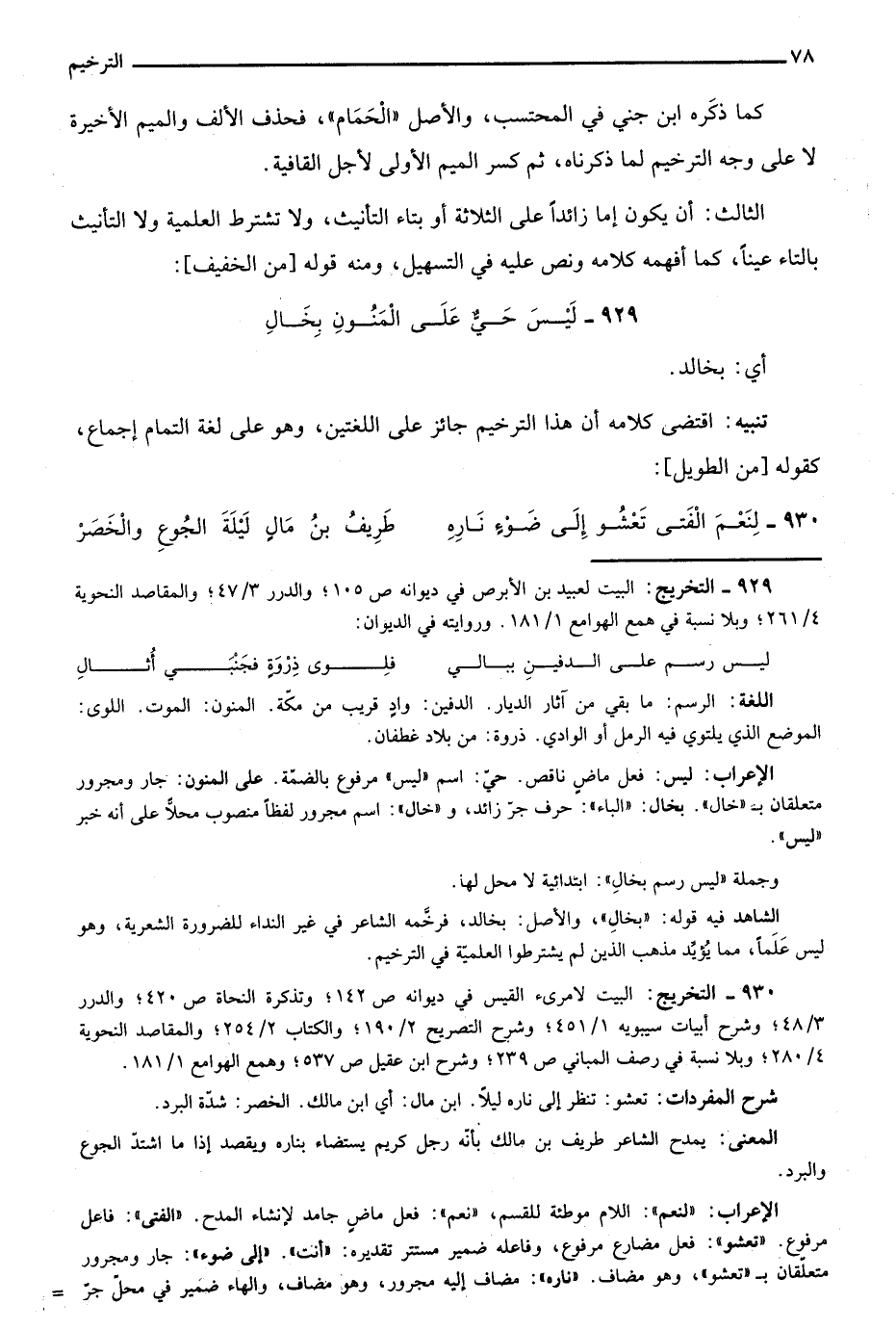 الشاهد فيه قوله: "بخال"، والأصل: بخالد، فرخمه الشاعر في غير النداء للضرورة الشعرية، وهو ليس علمًا، مما يؤيد مذهب الذين لم يشترطوا العلمية في الترخيم.