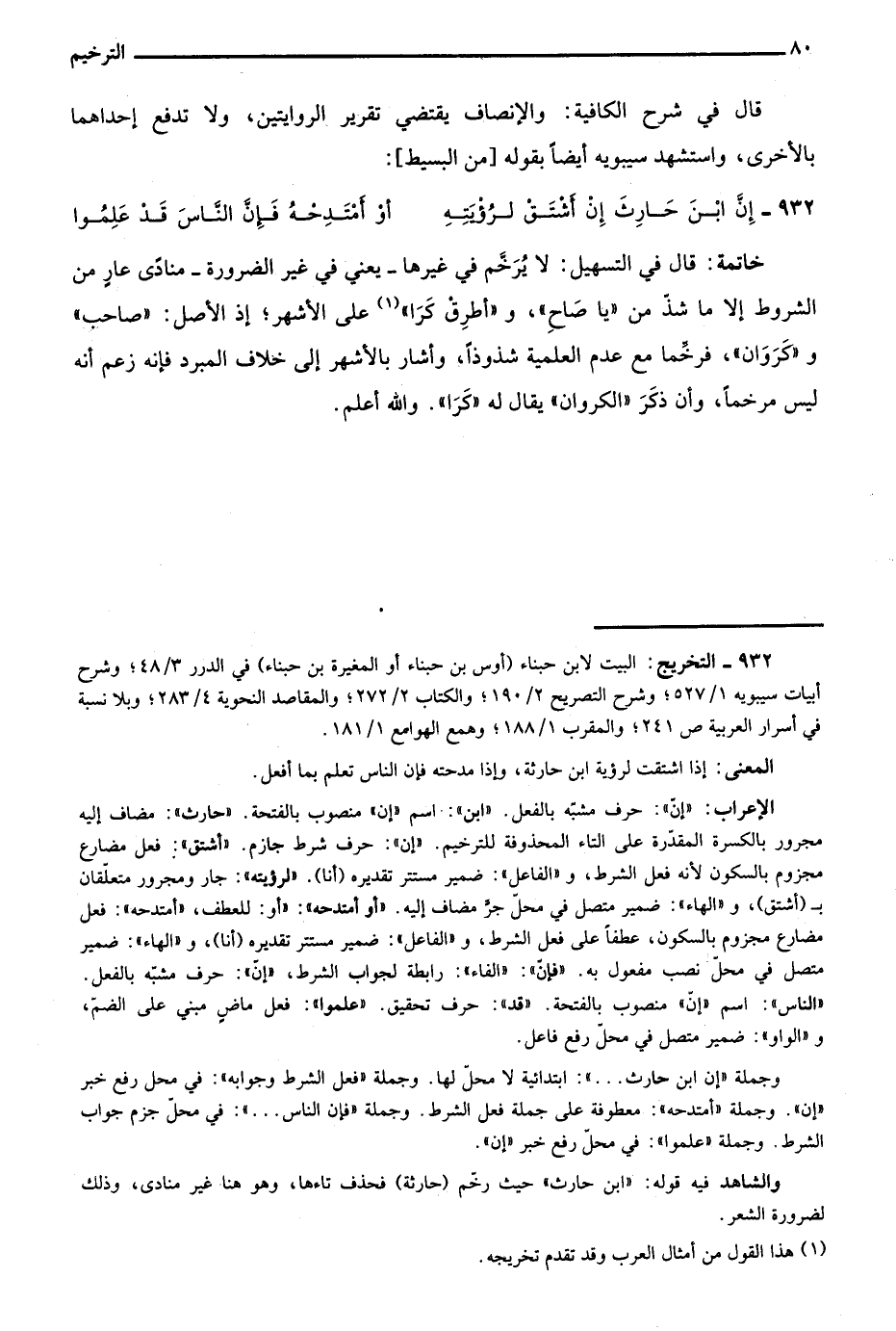 الإعراب: "إن": حرف مشبه بالفعل. "ابن": اسم "إن" منصوب بالفتحة. "حارث": مضاف إليه مجرور بالكسرة المقدرة على التاء المحذوفة للترخيم. "إن": حرف شرط جازم. "أشتق": فعل مضارع مجزوم بالسكون لأنه فعل الشرط، و"الفاعل": ضمير مستتر تقديره "أنا". "لرؤيته": جار ومجرور متعلقان بـ"أشتق"، و"الهاء": ضمير متصل في محل جر مضاف إليه."أو أمتدحه": "أو: للعطف، "أمتدحه": فعل مضارع مجزوم بالسكون، عطفًا على فعل الشرط، والفاعل: ضمير مستتر تقديره "أنا"، و"الهاء": ضمير متصل في محل نصب مفعول به. "فإن": "الفاء": رابطة لجواب الشرط، "إن": حرف مشبه بالفعل."الناس": اسم إن منصوب بالفتحة. "قد": حرف تحقيق. "علموا": فعل ماض مبني على الضم، و"الواو": ضمير متصل في محل رفع فاعل.