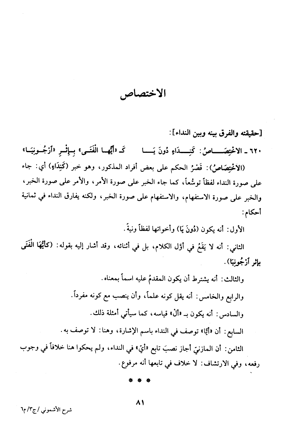 "الاِخْتِصَاصُ": قصر الحكم على بعض أفراد المذكور وهو خبر "كَنِدَاءٍ" أي: جاء على صورة النداء لفظًا توسعًا كما جاء الخبر على صورة الأمر والأمر على صورة الخبر والخبر على صورة الاستفهام والاستفهام على صورة الخبر لكنه يفارق النداء في ثمانية أحكام: