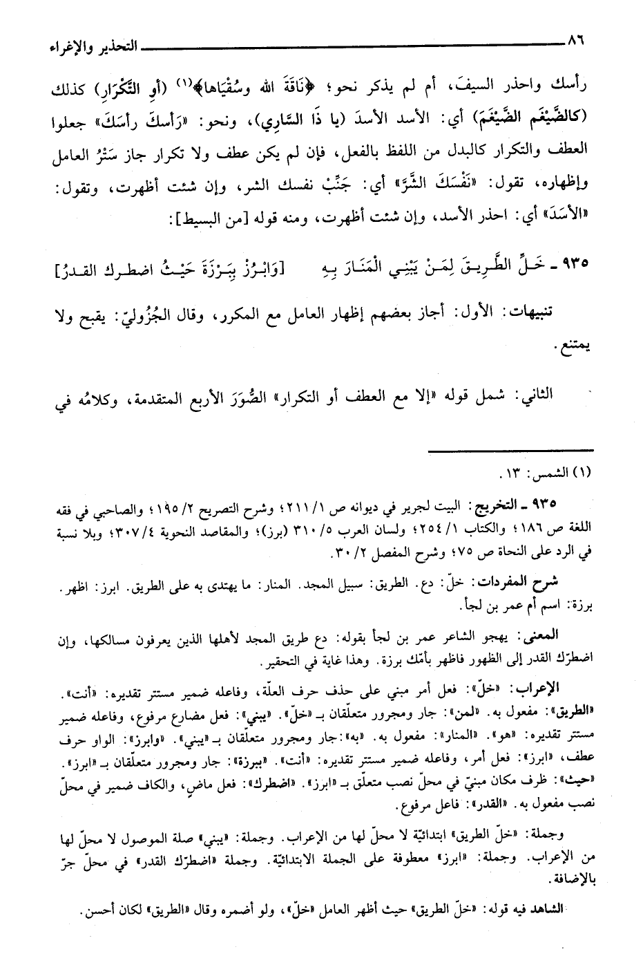 رأسك واحذر السيف، أم لم يذكر نحو: {نَاقَةَ اللَّهِ وَسُقْيَاهَا} 1، "أَوِ التَّكْرَارِ" كذلك "كالضَّيغَمَ الضَّيغَمَ" أي الأسد الأسد "يَا ذَا السَّارِي" ونحو: "رأسك رأسك" جعلوا العطف والتكرار كالبدل من اللفظ بالفعل، فإن لم يكن عطف ولا تكرار جاز ستر العامل وإظهاره، تقول: "نفسك الشر" أي جنب نفسك الشر، وإن شئت أظهرت، وتقول: "الأسد" أي: "احذر الأسد"، وإن شئت أظهرت، ومنه قوله "من البسيط":