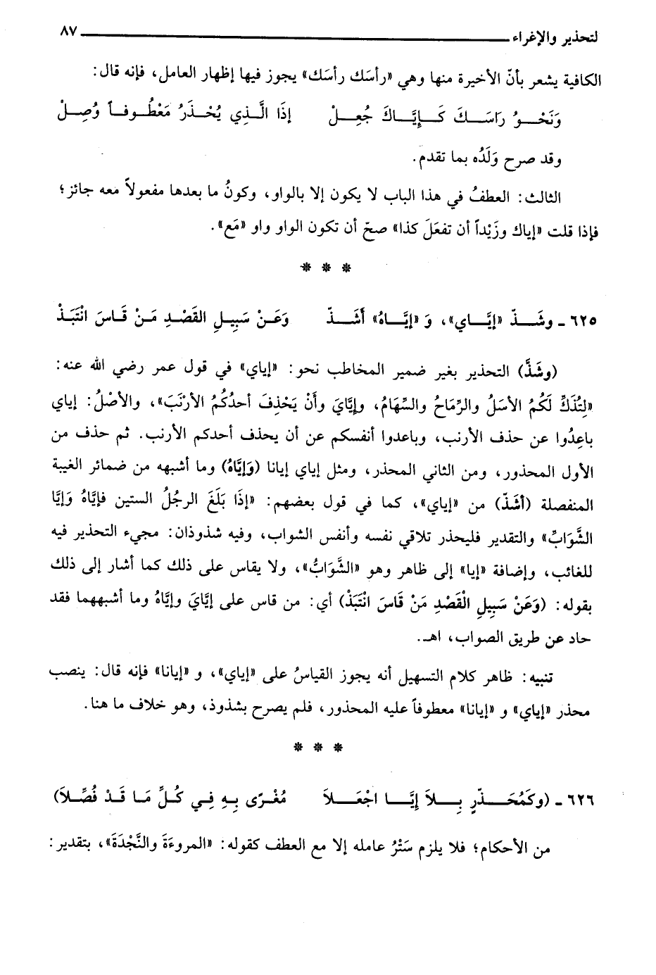 "وكَمُحَذِّرٍ بِلاَ إيَّا اجْعَلاَ ... مُغْرًى بِهِ فِي كلِّ مَا قَدْ فُصِّلاَ"