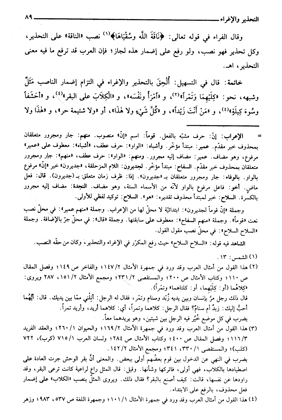 وقال الفراء في قوله تعالى: {نَاقَةَ اللَّهِ وَسُقْيَاهَا} 1، نصب "الناقة" على التحذير، وكل تحذير فهو نصب، ولو رفع على إضمار هذه لجاز فإن العرب قد ترفع ما فيه معنى التحذير، اهـ.