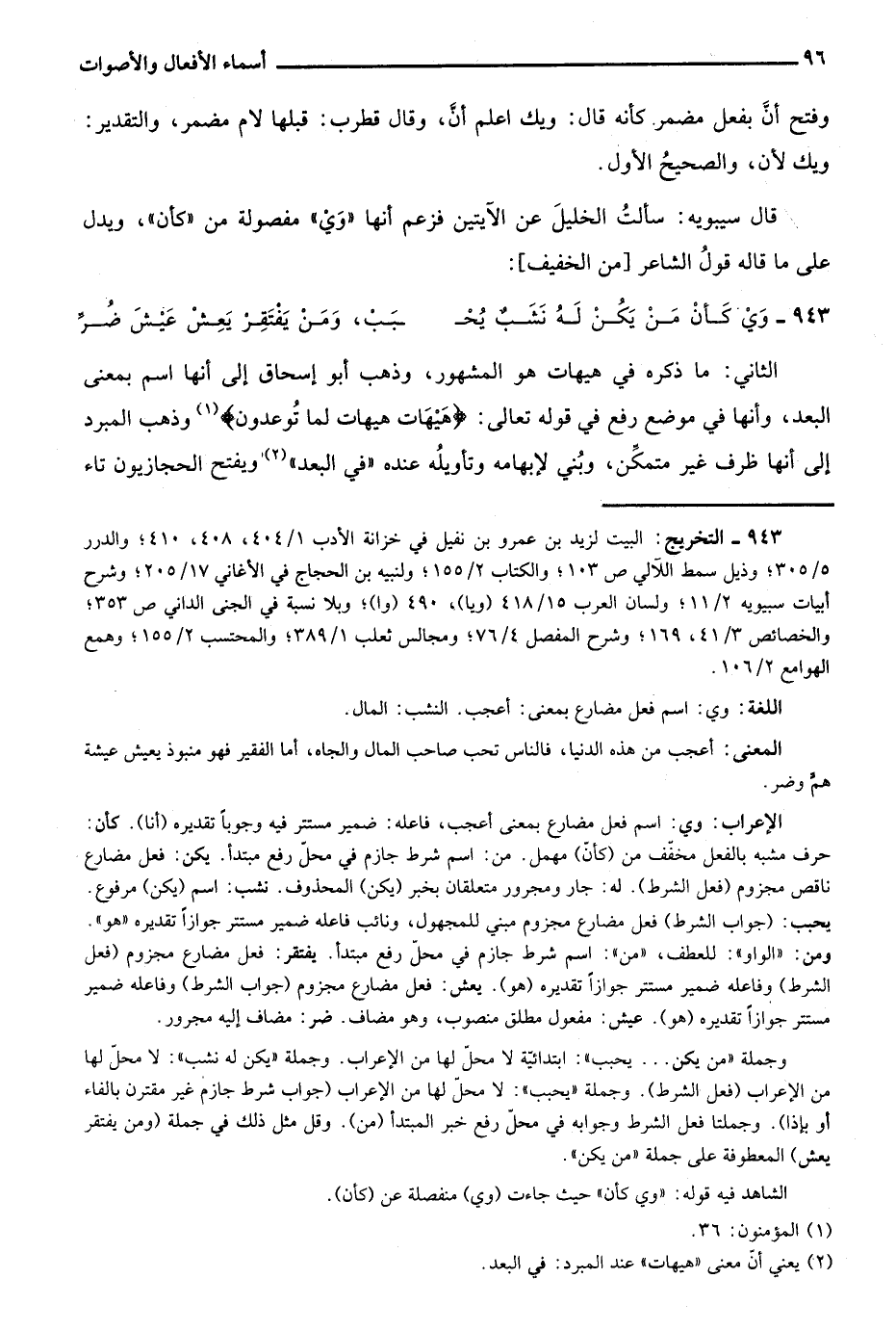 الإعراب: وي: اسم فعل مضارع بمعني أعجب، فاعله، ضمير مستتر فيه وجوبًا تقديره "أنا". كأن: حرف مشبه بالفعل مخفف من "كأن" مهمل. من: اسم شرط جازم في محل رفع مبتدأ. يكن: فعل مضارع ناقص مجزوم "فعل الشرط" له: جار ومجرور متعلقان بخبر "يكن" المحذوف. نشب: اسم "يكن" مرفوع.
