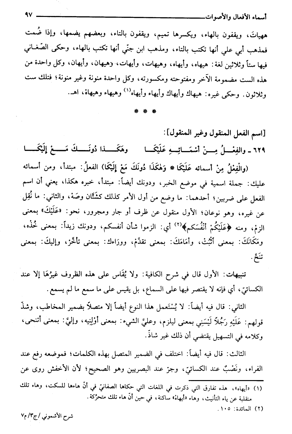 "وَالفِعْلُ مِنْ أَسْمَائِهِ عَلَيكَا وَهَكَذَا دُونَكَ مَعْ إلَيكَا" الفعل: مبتدأ ومن أسمائه عليك: جملة اسمية في موضع الخبر، ودونك أيضًا: مبتدأ، خبره هكذا، يعني أن اسم الفعل على ضربين؛ أحدهما: ما وضع من أوِّل الأمر كذلك كشتان وصه، والثاني: ما نقل عن غيره وهو نوعان؛ الأول: منقول عن ظرف أو جار ومجرور نحو: "عليك" بمعنى الزم، ومنه {عَلَيْكُمْ أَنْفُسَكُم} 2 أي: الزموا شأن أنفسكم، ودونك زيدًا: بمعنى خذه، ومكانك: بمعنى اثبت، وأمامك: بمعنى تقدَّم، ووراءك: بمعنى تأخر، وإليك: بمعنى تنح.