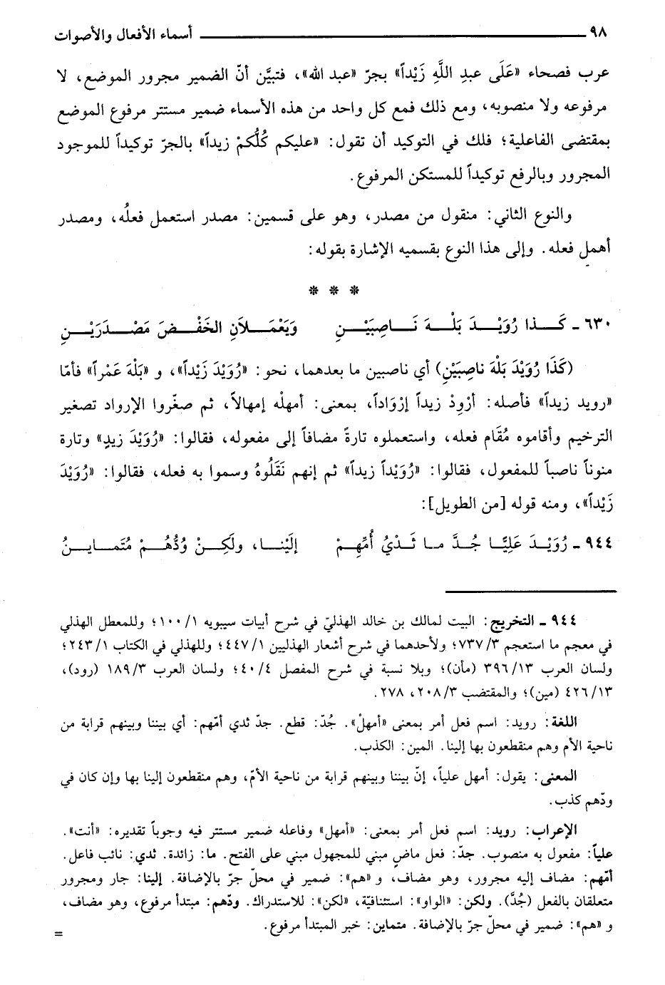 "كَذَا رُوَيدَ بَلهَ نَاصِبَينِ" أي ناصبين ما بعدهما، نحو: "رويد زيدًا" و"بله عمرًا"، فأما "رويد زيدًا" فأصله أرود زيدًا أروادًا بمعنى أمهله إمهالًا، ثم صغروا الإرواد تصغير الترخيم وأقاموه مقام فعله واستعملوه تارة مضافًا إلى مفعوله فقالوا: "رويد زيد"، وتارة منوّنًا ناصبًا للمفعول فقالوا: "رويدًا زيدًا"، ثم إنهم نقلوه وسموا به فعله فقالوا: "رويد زيدًا"، ومنه قوله "من الطويل":