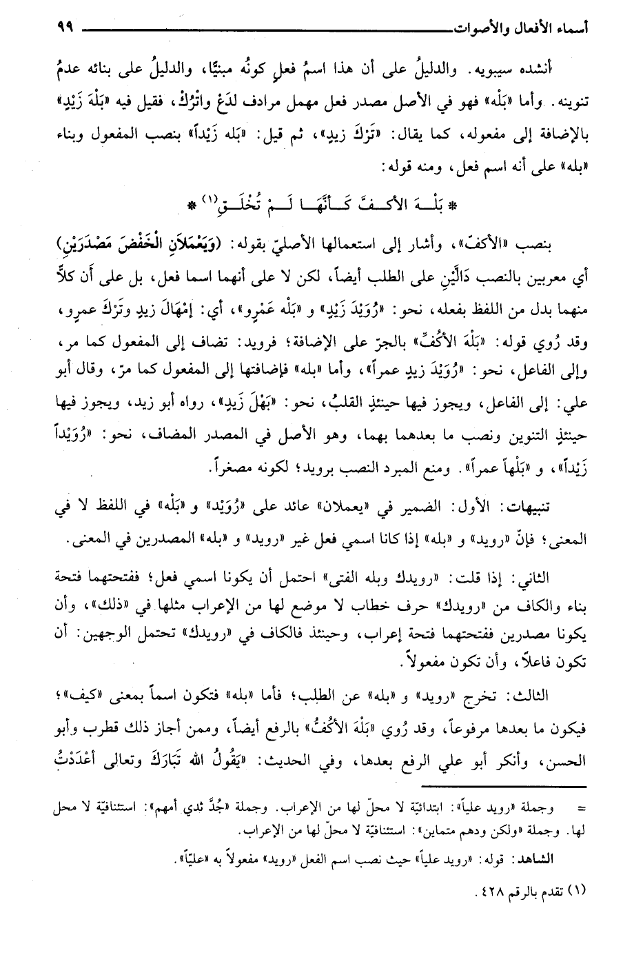 تنبيهات: الأوّل الضمير في "يعملان" عائد على "رويد" و"بله" في اللفظ لا في المعنى، فإن "رويد" و"بله" إذا كانا اسمي فعل غير "رويد" و"بله" المصدرين في المعنى.