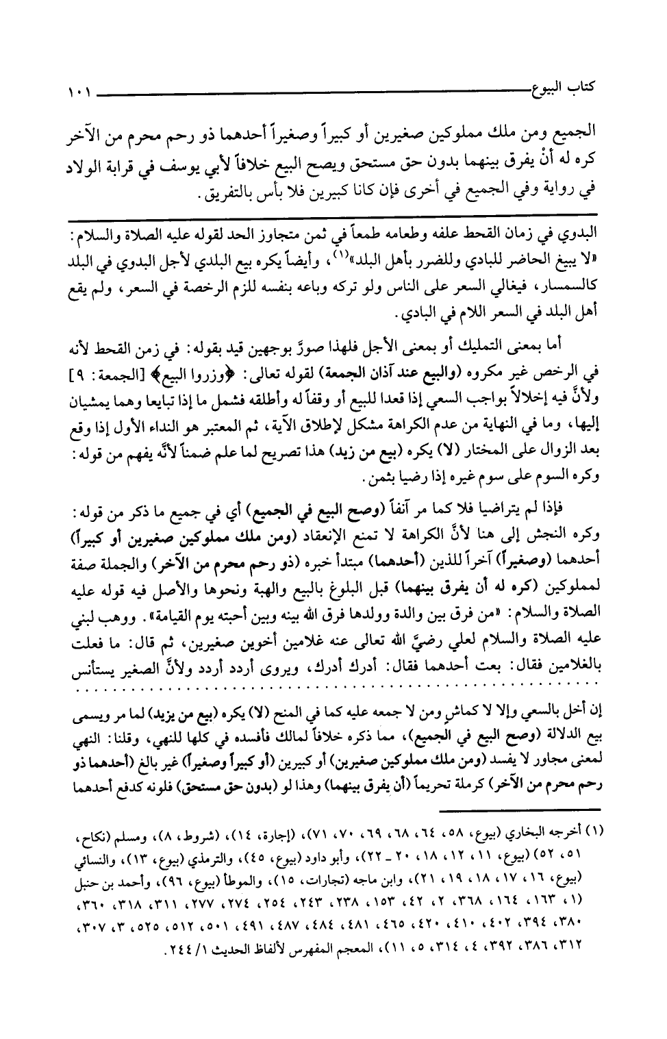 ومن ملك مملوكين صغيرين أو كبيرا أحدهما وصغيرا آخر للذين أحدهما مبتدأ خبره ذو رحم محرم من الآخر والجملة صفة لمملوكين كره له أن يفرق بينهما قبل البلوغ بالبيع والهبة ونحوها والأصل فيه قوله عليه الصلاة والسلام من فرق بين والدة وولدها فرق الله بينه وبين أحبته يوم القيامة ووهب النبي عليه الصلاة والسلام لعلي رضي الله تعالى عنه غلامين أخوين صغيرين ثم قال له ما فعلت بالغلامين فقال بعت أحدهما فقال أدرك أدرك ويروى اردد اردد ولأن الصغير يستأنس