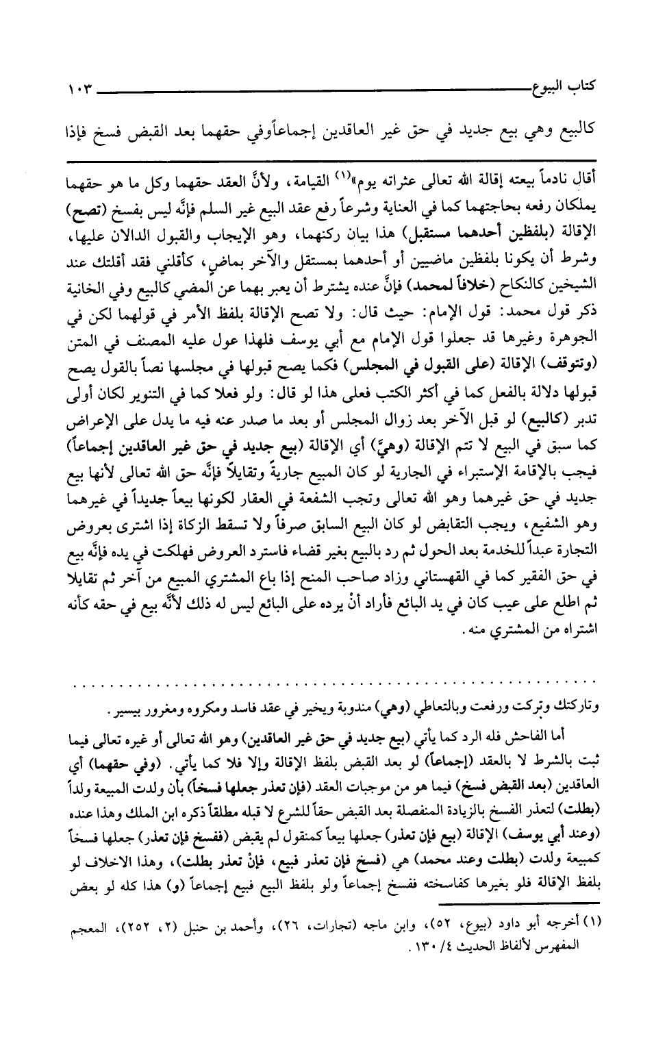أقال نادما بيعته أقاله الله تعالى عثراته يوم القيامة ولأن العقد حقهما وكل ما هو حقهما يملكان رفعه بحاجتهما كما في العناية وشرعا رفع عقد البيع غير السلم فإنه ليس بفسخ تصح الإقالة بلفظين أحدهما مستقبل هذا بيان ركنهما وهو الإيجاب والقبول الدالان عليها وشرط أن يكونا بلفظين ماضيين أو أحدهما بمستقبل والآخر بماض كأقلني فقد أقلتك عند الشيخين كالنكاح خلافا لمحمد فإن عنده يشترط أن يعبر بهما عن المضي كالبيع