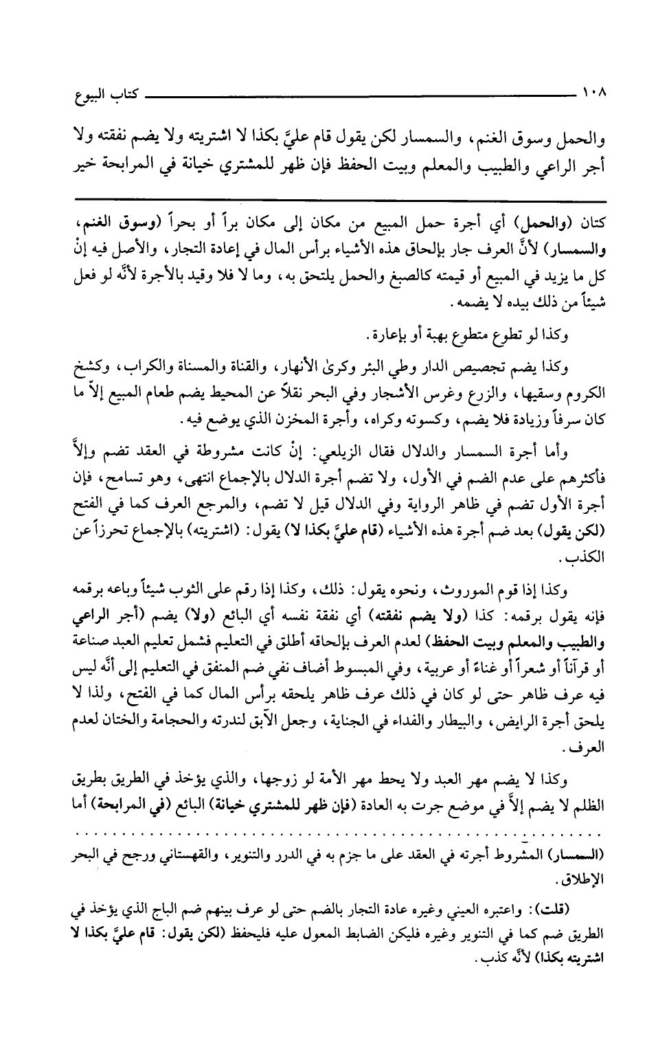 كتان والحمل أي أجرة حمل المبيع من مكان إلى مكان برا أو بحرا وسوق الغنم والسمسار لأن العرف جار بإلحاق هذه الأشياء برأس المال في عادة التجار والأصل فيه أن كل ما يزيد في المبيع أو قيمته كالصبغ والحمل يلحق به وما لا فلا وقيد بالأجرة لأنه لو فعل شيئا من ذلك بيده لا يضمه وكذا لو تطوع متطوع بهبة أو بإعارة وكذا يضم تجصيص الدار وطي البئر وكري الأنهار والقناة والمسناة والكراب وكشنح الكروم وسقيها والزرع وغرس الأشجار