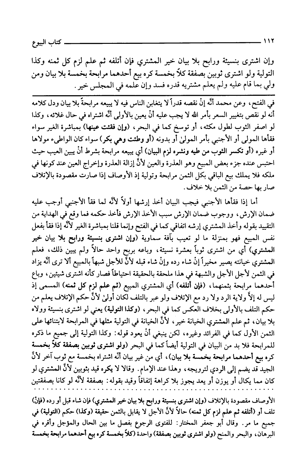 ولو اشترى ثوبين بصفقة كلا بخمسة كره بيع أحدهما مرابحة بخمسة بلا بيان أي من غير بيان أنه اشتراه بخمسة مع ثوب آخر لأن الجيد قد يضم إلى الرديء لترويجه وهذا عند الإمام وقالا لا يكره قيد بثوبين لأن المشترى لو كان مما يكال أو يوزن أو يعد يجوز بلا كراهة اتفاقا وقيد بقوله بصفقة لأنه لو كانا بصفقتين