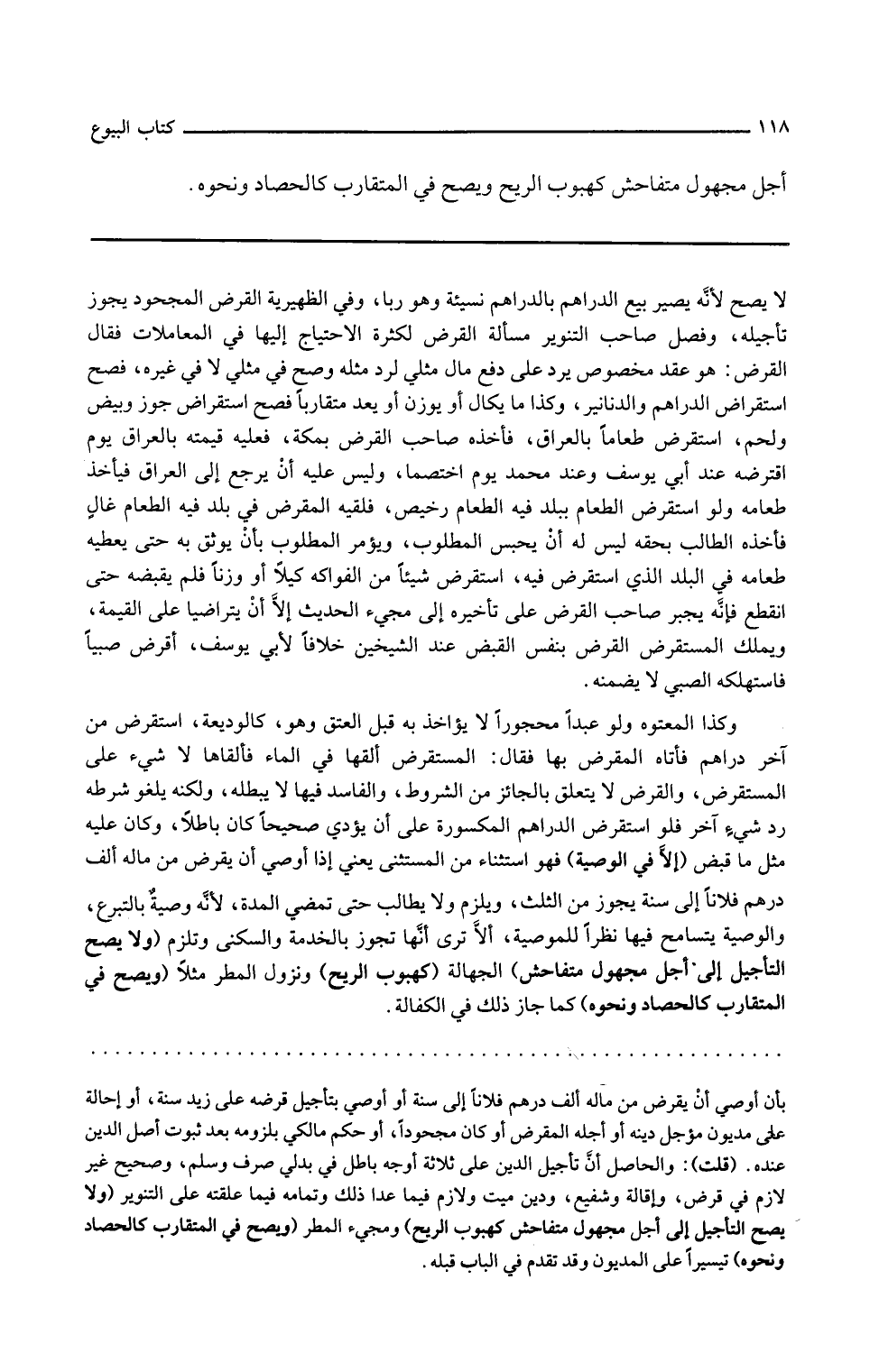وفي الظهيرية القرض المجحود يجوز تأجيله وفصل صاحب التنوير مسألة القرض لكثرة الاحتياج إليها في المعاملات فقال القرض هو عقد مخصوص يرد على دفع مال مثلي لرد مثله وصح في مثلي لا في غيره فصح استقراض الدراهم والدنانير وكذا ما يكال أو يوزن أو يعد متقاربا فصح استقراض جوز وبيض ولحم استقرض طعاما بالعراق فأخذه صاحب القرض بمكة فعليه قيمته بالعراق يوم اقترضه عند أبي يوسف وعند محمد يوم اختصما وليس عليه أن يرجع إلى العراق فيأخذ طعامه