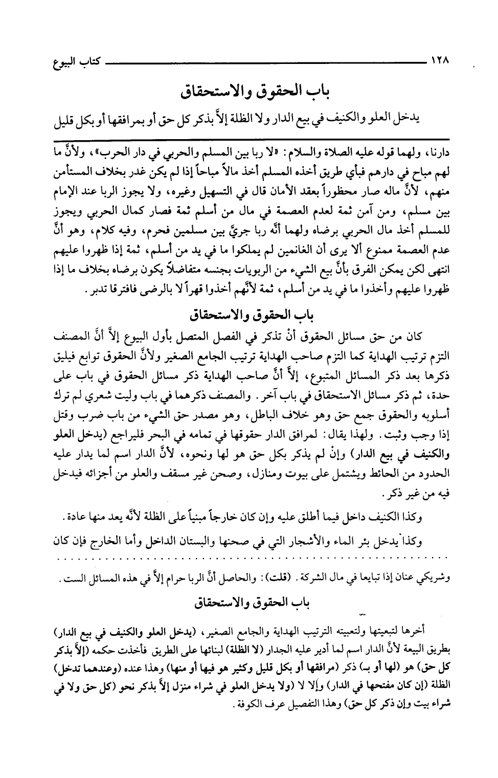 كان من حق مسائل الحقوق أن تذكر في الفصل المتصل بأول البيوع إلا أن المصنف التزم ترتيب الهداية كما التزم صاحب الهداية ترتيب الجامع الصغير ولأن الحقوق توابع فيليق ذكرها بعد ذكر المسائل المتبوع إلا أن صاحب الهداية ذكر مسائل الحقوق في باب على حدة ثم ذكر مسائل الاستحقاق في باب آخر والمصنف ذكرهما في باب وليت شعري لم ترك أسلوبه والحقوق جمع حق وهو خلاف الباطل وهو مصدر حق الشيء من باب ضرب وقتل إذا وجب وثبت ولهذا يقال لمرافق الدار حقوقها وتمامه في البحر فليراجع يدخل العلو والكنيف في بيع الدار وإن لم يذكر بكل حق هو لها ونحوه لأن الدار اسم لما يدار عليه الحدود من الحائط ويشتمل على بيوت ومنازل وصحن غير مسقف والعلو من أجزائه فيدخل فيه من غير ذكر وكذا الكنيف داخل فيما أطلق عليه وإن كان خارجا مبنيا على الظلة لأنه يعد منها عادة وكذا يدخل بئر الماء والأشجار التي في صحنها والبستان الداخل وأما الخارج فإن كان
