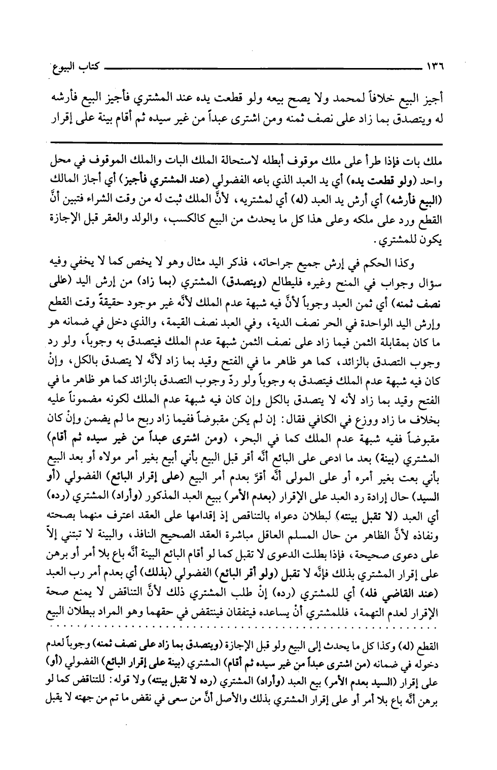 ومن اشترى عبدا من غير سيده ثم أقام المشتري بينة بعد ما ادعى على البائع أنه أقر قبل البيع بأني أبيع بغير أمر مولاه أو بعد البيع بأني بعت بغير أمره أو على المولى أنه أقر بعدم أمر البيع على إقرار البائع الفضولي أو السيد حال إرادة رد العبد على الإقرار بعدم الأمر ببيع العبد المذكور وأراد المشتري رده أي العبد لا تقبل بينته لبطلان دعواه بالتناقض إذ إقدامهما على العقد اعتراف منهما بصحته ونفاذه لأن الظاهر من حال المسلم العاقل مباشرة العقد الصحيح النافذ والبينة لا تبتنى إلا على دعوى صحيحة فإذا بطلت الدعوى لا تقبل كما لو أقام البائع البينة أنه باع بلا أمر أو برهن على إقرار المشتري بذلك فإنه لا تقبل