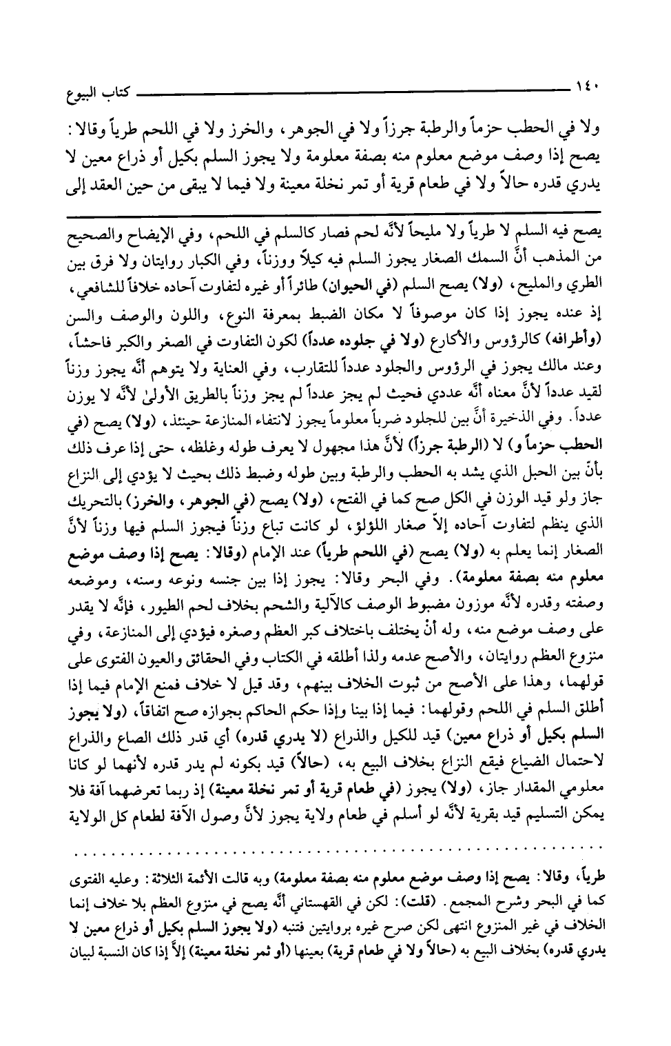 ولا يصح في اللحم طريا عند الإمام وقالا يصح إذا وصف موضع معلوم منه بصفة معلومة
