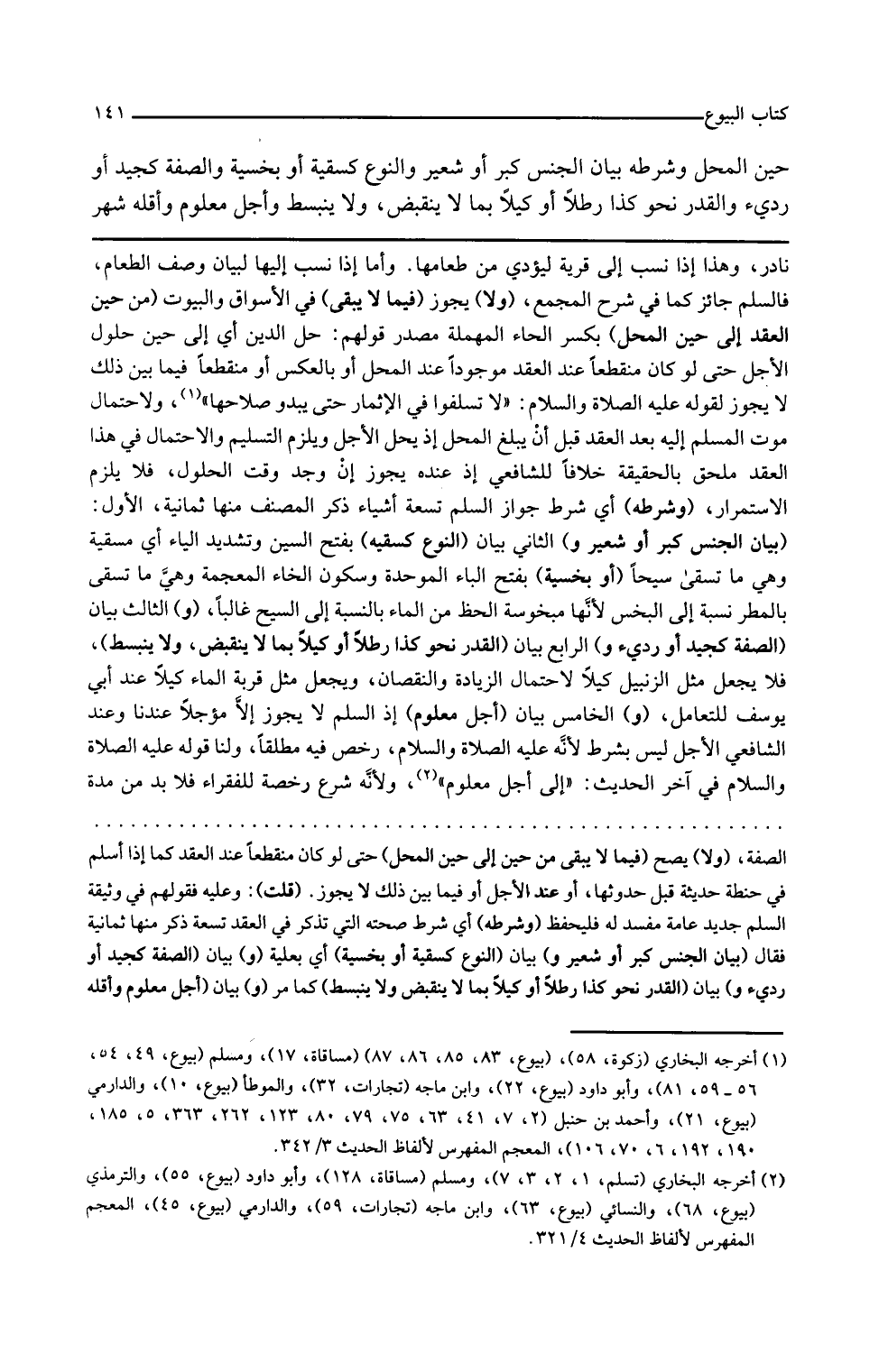 وشرطه أي شرط جواز السلم تسعة أشياء ذكر المصنف منها ثمانية الأول بيان الجنس كبر أو شعير و الثاني بيان النوع كسقية بفتح السين وتشديد الياء أي مسقية وهي ما تسقى سيحا أو بخسية بفتح الباء الموحدة وسكون الخاء المعجمة وهي ما تسقى بالمطر نسبة إلى البخس لأنها مبخوسة الحظ من الماء بالنسبة إلى السيح غالبا