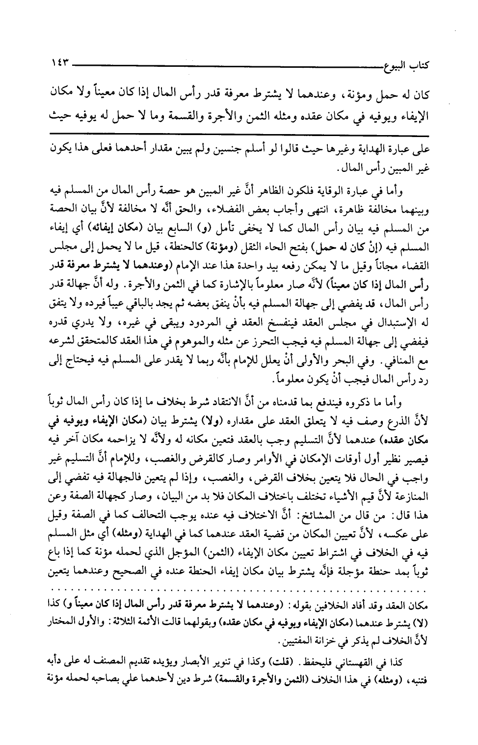 والسابع بيان مكان إيفائه أي إيفاء المسلم فيه إن كان له حمل بفتح الحاء الثقل ومؤنة كالحنطة قيل ما لا يحمل إلى مجلس القضاء مجانا وقيل ما لا يمكن رفعه بيد واحدة هذا عند الإمام وعندهما لا يشترط معرفة قدر رأس المال إذا كان معينا لأنه صار معلوما بالإشارة كما في الثمن والأجرة