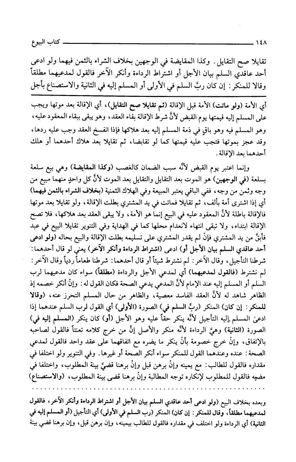 وكذا المقايضة وهي بيع سلعة بسلعة في الوجهين هو الموت بعد التقايل والتقايل بعد الموت لأن كل واحد منهما مبيع من وجه وثمن من وجه ففي الباقي يعتبر المبيعة وفي الهلاك الثمنية بخلاف الشراء بالثمن فيهما أي إذا اشترى أمة بألف ثم تقايلا فماتت في يد المشتري بطلت الإقالة ولو تقايلا بعد موتها فالإقالة باطلة لأن المعقود عليه في البيع إنما هو الأمة ولا يبقى العقد بعد هلاكها فلا تصح الإقالة ابتداء ولا تبقى انتهاء لانعدام محلها كما في الهداية