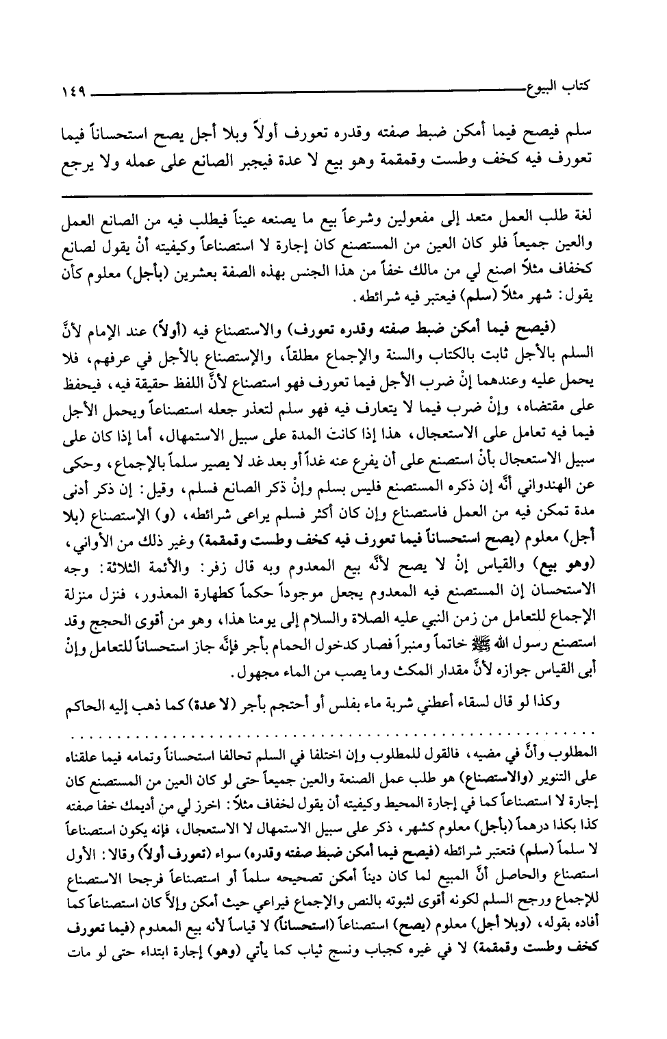 لغة طلب العمل متعد إلى مفعولين وشرعا بيع ما يصنعه عينا فيطلب فيه من الصانع العمل والعين جميعا فلو كان العين من المستصنع كان إجارة لا استصناعا وكيفيته أن يقول لصانع كخفاف مثلا اصنع لي من مالك خفا من هذا الجنس بهذه الصفة بعشرين بأجل معلوم كأن يقول شهرا مثلا سلم فيعتبر فيه شرائطه فيصح فيما أمكن ضبط صفته وقدره تعورف الاستصناع فيه أو لا عند الإمام لأن السلم بالأجل ثابت بالكتاب والسنة والإجماع مطلقا والاستصناع بالأجل في عرفهم فلا يحمل عليه وعندهما إن ضرب الأجل فيما تعورف فهو استصناع لأن اللفظ حقيقة فيه فيحفظ على مقتضاه وإن ضرب فيما لا يتعارف فيه فهو سلم لتعذر جعله استصناعا ويحمل الأجل فيما فيه تعامل على الاستعجال هذا إذا كانت المدة على سبيل الاستمهال أما إذا كان على سبيل الاستعجال بأن استصنع على أن يفرغ عنه غدا أو بعد غد لا يصير سلما بالإجماع وحكي عن الهندواني أنه إن ذكره المستصنع فليس بسلم وإن ذكر الصانع فسلم وقيل إن ذكر أدنى مدة تمكن فيه من العمل فاستصناع وإن كان أكثر فسلم يراعى شرائطه
