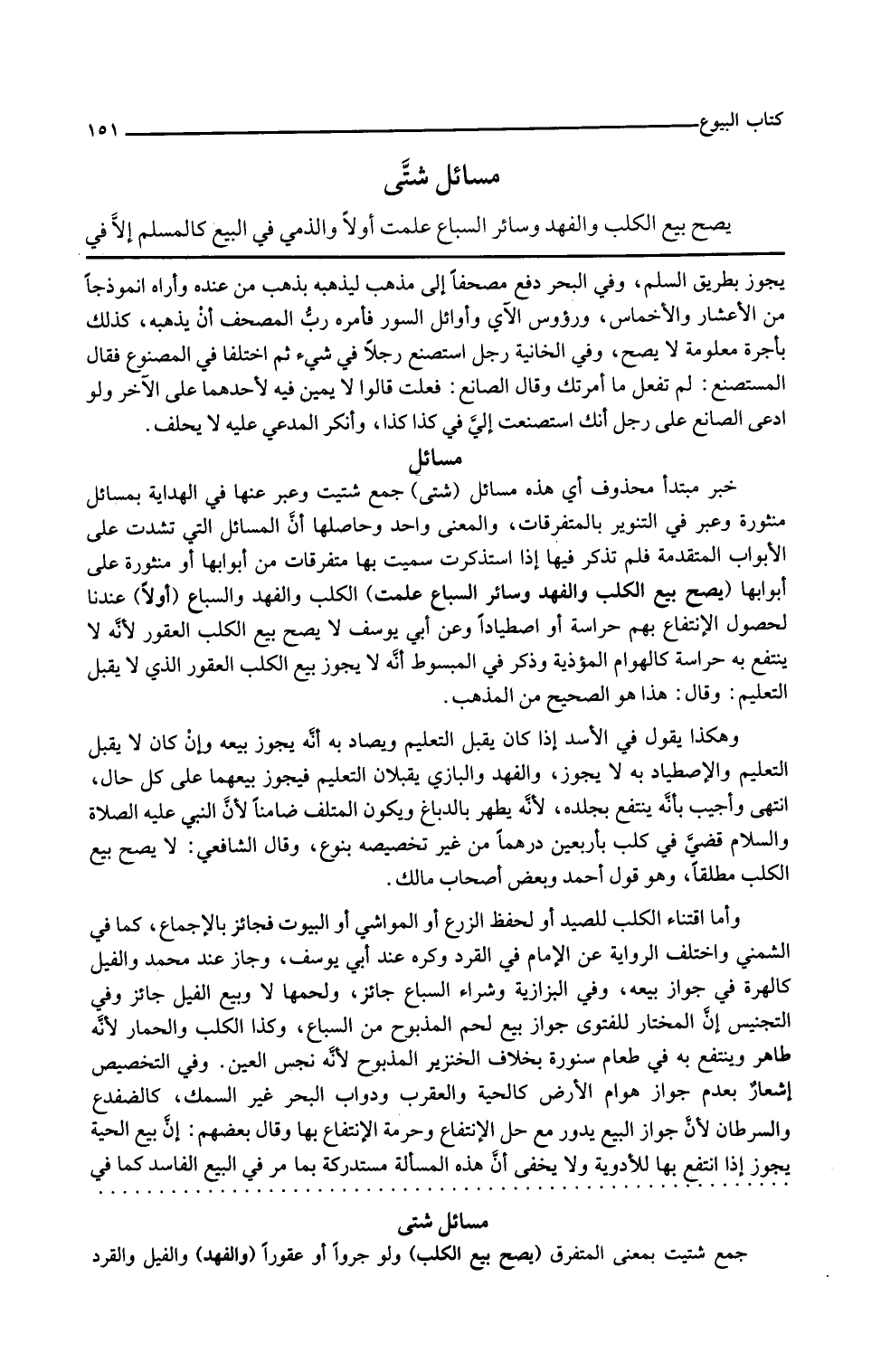 وفي التنجيس أن المختار للفتوى جواز بيع لحم المذبوح من السباع وكذا الكلب والحمار لأنه طاهر وينتفع به في إطعام سنورة بخلاف الخنزير المذبوح لأنه نجس العين وفي التخصيص إشعار بعدم جواز هوام الأرض كالحية والعقرب ودواب البحر غير السمك كالضفدع والسرطان لأن جواز البيع يدور مع حل الانتفاع وحرمة الانتفاع بها وقال بعضهم إن بيع الحية يجوز إذا انتفع بها للأدوية ولا يخفى أن هذه المسألة مستدركة بما مر في البيع الفاسد كما في