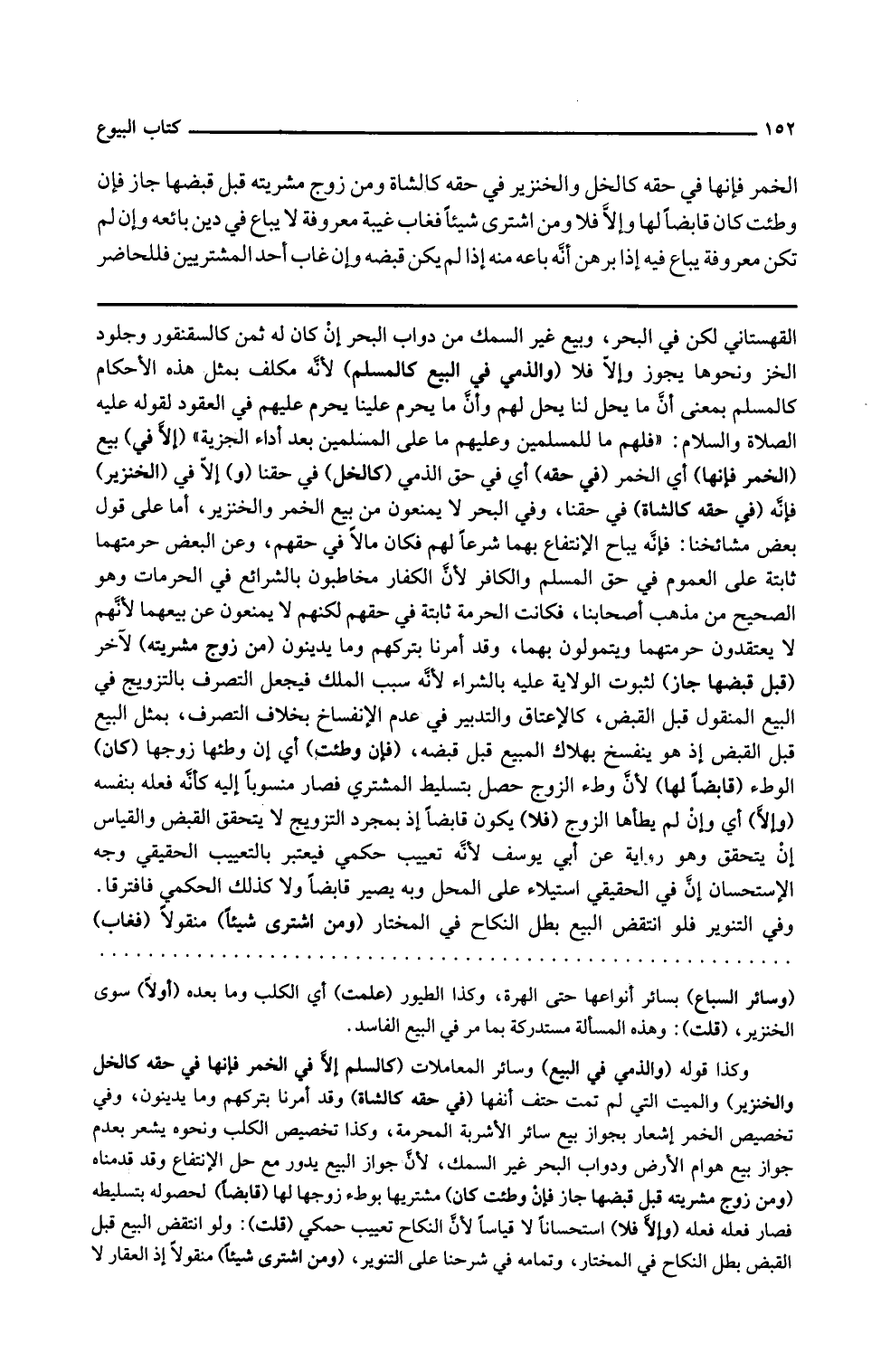 والذمي في البيع كالمسلم لأنه مكلف بمثل هذه الأحكام كالمسلم بمعنى أن ما يحل لنا يحل لهم وأن ما يحرم علينا يحرم عليهم في العقود لقوله عليه الصلاة والسلام فلهم ما للمسلمين وعليهم ما على المسلمين بعد أداء الجزية إلا في بيع الخمر فإنها أي الخمر في حقه أي في حق الذمي كالخل في حقنا