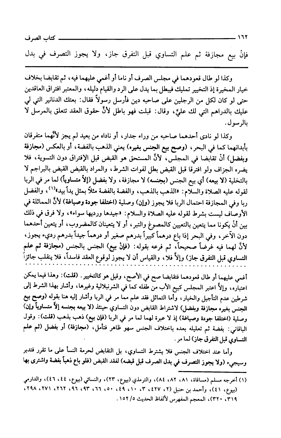وصح بيع الجنس بغيره يعني الذهب بالفضة أو بالعكس مجازفة وبفضل إن تقابضا في المجلس لأن المستحق هو القبض قبل الافتراق دون التسوية فلا يضره الجزاف ولو افترقا قبل القبض بطل لفوات الشرط والمراد بالقبض القبض بالبراجم لا بالتخلية لا بيعه أي بيع الجنس بجنسه لا مجازفة ولا بفضل إلا متساويا لما مر في الربا لقوله عليه الصلاة والسلام الذهب بالذهب والفضة بالفضة مثلا بمثل يدا بيد والفضل ربا وفي المجازفة احتمال الربا فلا يجوز وإن وصلية اختلفا جودة وصياغة لأن المماثلة في الأوصاف ليست بشرط لقوله عليه الصلاة والسلام جيدها ورديئها سواء ولا فرق في ذلك بين أن يكونا مما يتعين بالتعيين كالمصوغ والتبر أو لا يتعينان كالمضروب أو يتعين أحدهما دون الآخر