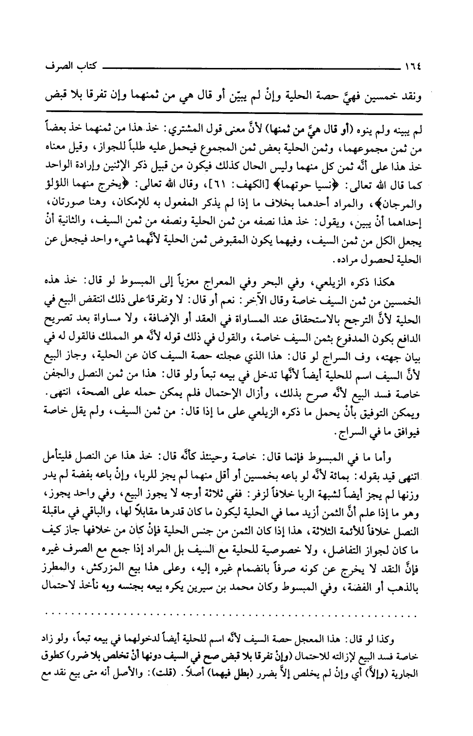 وفي السراج لو قال هذا الذي عجلته حصة السيف كان عن الحلية وجاز البيع لأن السيف اسم للحلية أيضا لأنها تدخل في بيعه تبعا ولو قال هذا من ثمن النصل والجفن خاصة فسد البيع لأنه صرح بذلك وأزال الاحتمال فلم يمكن حمله على الصحة انتهى ويمكن التوفيق بأن يحمل ما ذكره الزيلعي على ما إذا قال من ثمن السيف ولم يقل خاصة فيوافق ما في السراج وأما ما في المبسوط فإنما قال خاصة وحينئذ كأنه قال خذ هذا عن النصل فليتأمل انتهى