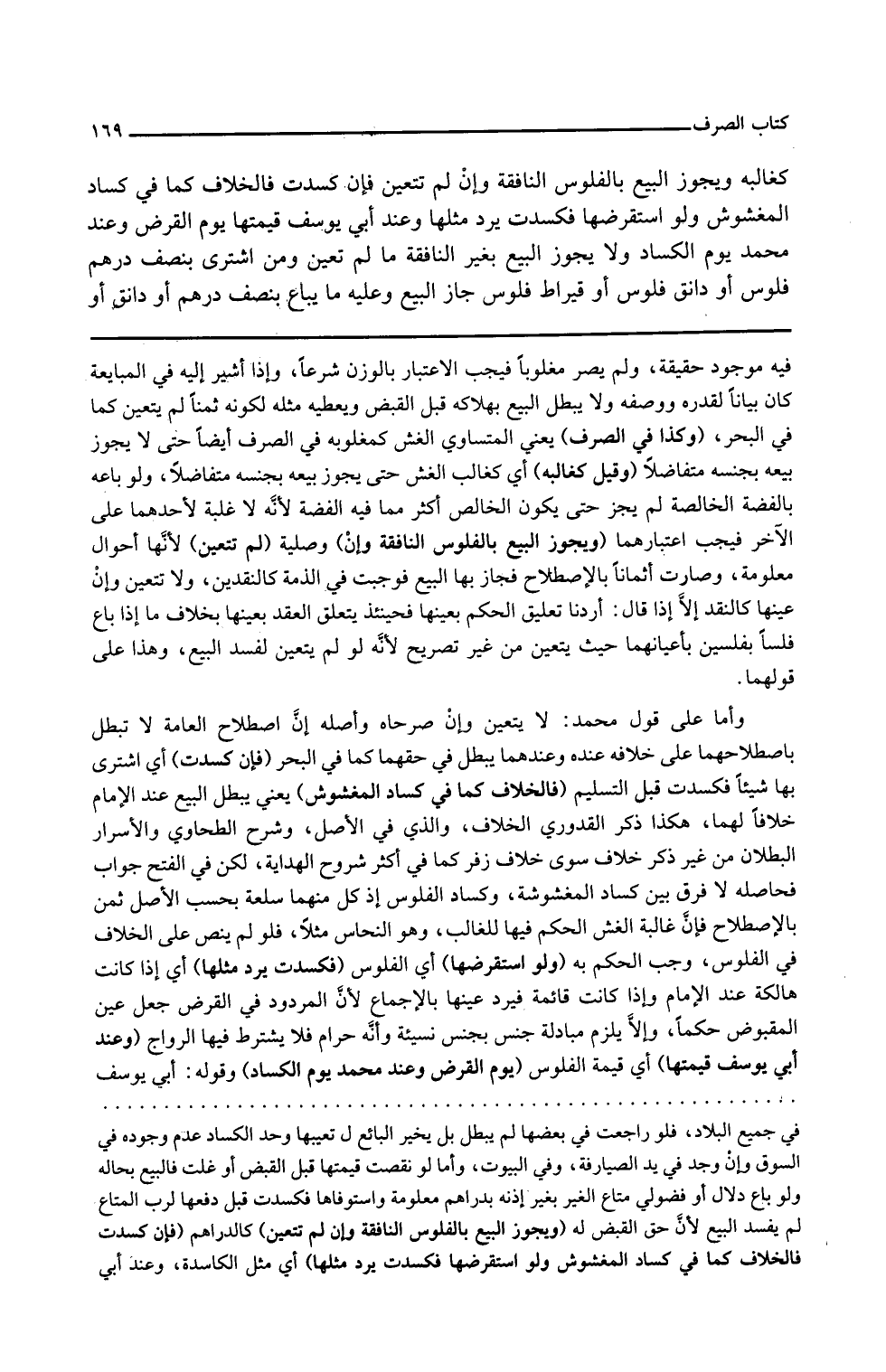 والذي في الأصل وشرح الطحاوي والأسرار البطلان من غير ذكر خلاف سوى خلاف زفر كما في أكثر شروح الهداية لكن في الفتح جواب فحاصله لا فرق بين كساد المغشوشة وكساد الفلوس إذ كل منهما سلعة بحسب الأصل ثمن بالاصطلاح فإن غالبة الغش الحكم فيها للغالب وهو النحاس مثلا فلو لم ينص على الخلاف في الفلوس وجب الحكم به