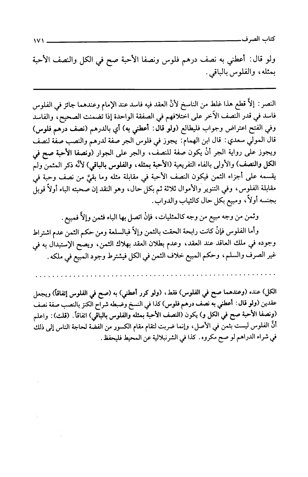 ولو قال أعطني به أي بالدرهم نصف درهم فلوس قال المولى سعدي قال ابن الهمام يجوز في فلوس الجر صفة لدرهم والنصب صفة لنصف ويجوز على رواية الجر أن يكون صفة للنصف والجر على الجوار ونصفا إلا حبة صح في الكل والنصف والأولى بالفاء التفريعية إلا حبة بمثله والفلوس بالباقي لأنه ذكر المثمن ولم يقسمه على أجزاء الثمن فيكون النصف إلا حبة في مقابلة مثله وما بقي من نصف وحبة في مقابلة الفلوس