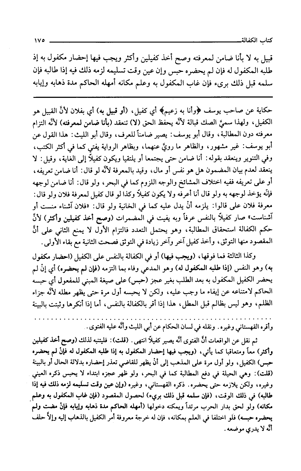 ويجب فيها أو في الكفالة بالنفس على الكفيل إحضار مكفول به وهو النفس إذا طلبه المكفول له وهو المدعي وفاء بما التزمه فإن لم يحضره أي إن لم يحضر الكفيل المكفول به بعد الطلب بغير عجز حبس على صيغة المبني للمفعول أي حبسه الحاكم لامتناعه عن إيفاء ما وجب عليه ولكن لا يحبسه أول مرة حتى يظهر مطله لأنه جزاء الظلم وهو ليس بظالم قبل المطل هذا إذا أقر بالكفالة بالنفس أما إذا أنكرها وثبتت بالبينة