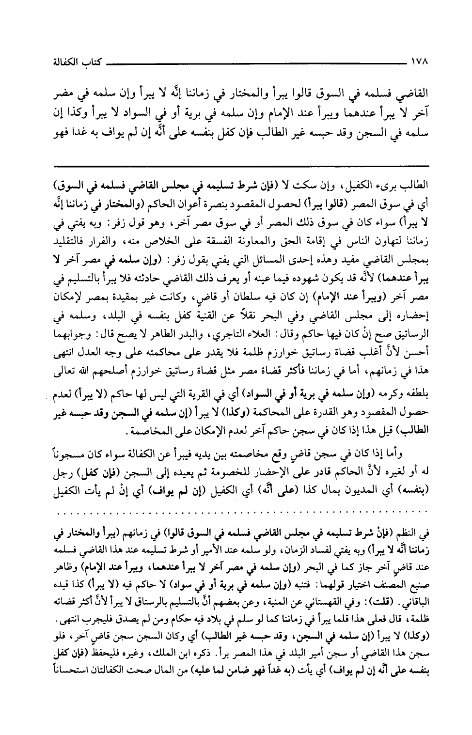 الطالب برئ الكفيل وإن سكت لا فإن شرط تسليمه في مجلس القاضي فسلمه في السوق أي في سوق المصر قالوا يبرأ لحصول المقصود بنصرة أعوان الحاكم والمختار في زماننا أنه لا يبرأ سواء كان في سوق ذلك المصر أو في سوق مصر آخر وهو قول زفر وبه يفتى في زماننا لتهاون الناس في إقامة الحق ولمعاونة الفسقة على الخلاص منه والفرار فالتقليد بمجلس القاضي مفيد وهذه إحدى المسائل التي يفتى بقول زفر