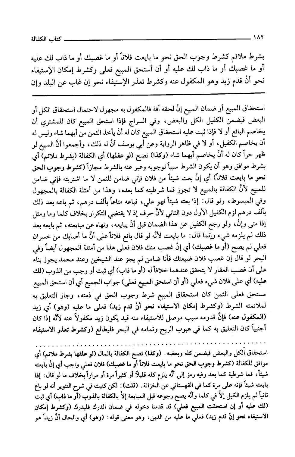 وعند محمد يجوز بناء على أن غصب العقار لا يتحقق عندهما خلافا له أو ما ذاب أي ثبت أو وجب من الذوب لك عليه أي على فلان شيء فعلي أو إن استحق المبيع فعلي جواب الجميع أي إن استحق المبيع مستحق فعلي الثمن كان استحقاق المبيع شرط وجوب الحق في ذمته وجاز التعليق به لملاءمته الشرط وكشرط إمكان الاستيفاء نحو إن قدم زيد فعلي ما عليه وهو أي زيد المكفول عنه فإن قدومه سبب موصل للاستيفاء منه قيد بكون زيد مكفولا عنه لأنه إذا كان أجنبيا كان التعليق به كما في هبوب الريح وتمامه في البحر فليطالع
