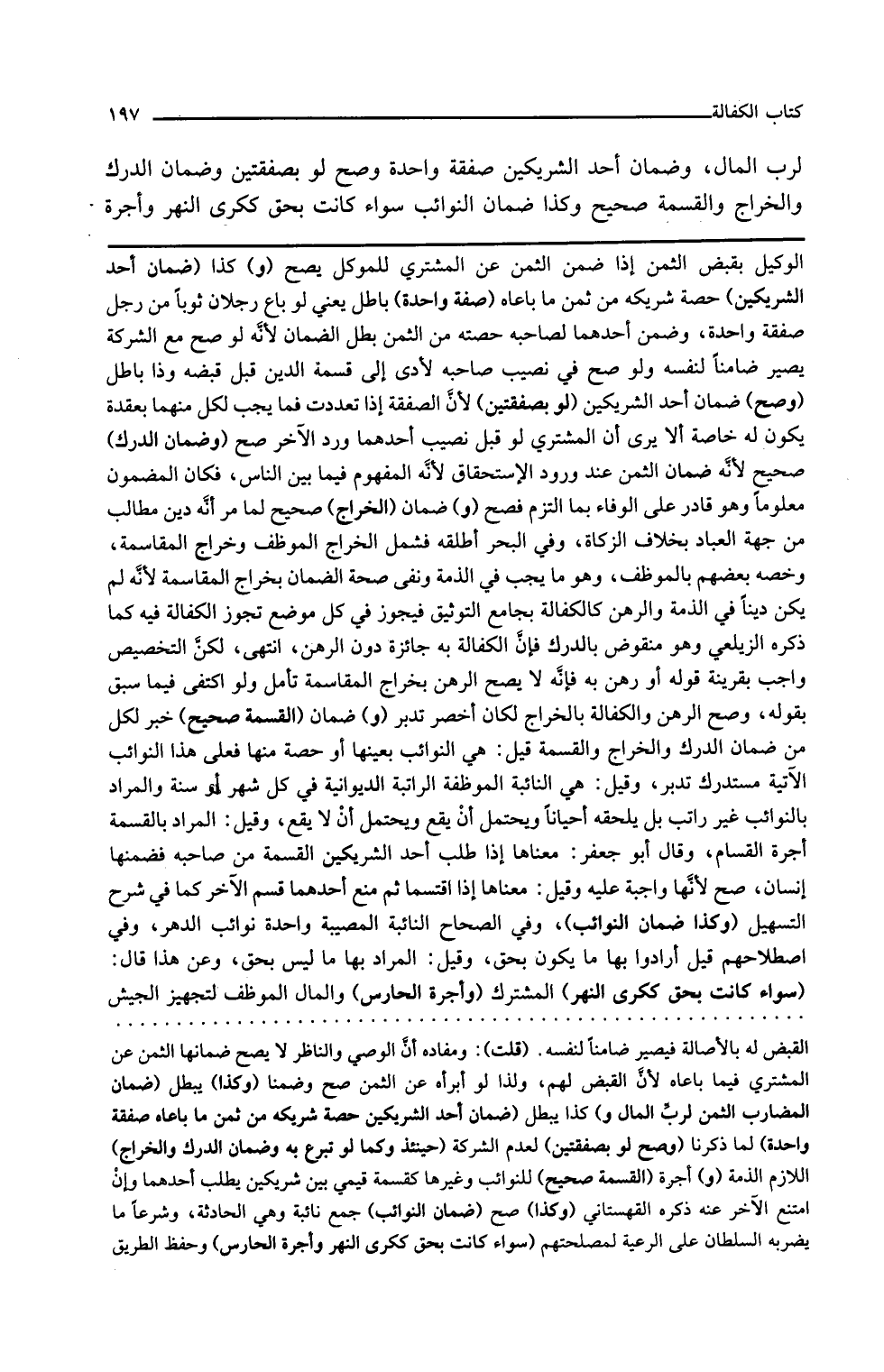 و كذا ضمان أحد الشريكين حصة شريكه من ثمن ما باعاه صفقة واحدة باطل يعني لو باع رجلان ثوبا من رجل صفقة واحدة وضمن أحدهما لصاحبه حصته من الثمن بطل الضمان لأنه لو صح من الشركة يصير ضامنا لنفسه ولو صح في نصيب صاحبه لأدى إلى قسمة الدين قبل قبضه وذا باطل وصح ضمان أحد الشريكين لو بصفقتين لأن الصفقة إذا تعددت فما يجب لكل منهما بعقدة يكون له خاصة ألا يرى أن المشتري لو قبل نصيب أحدهما ورد الآخر صح وضمان الدرك صحيح لأنه ضمان الثمن عند ورود الاستحقاق لأنه المفهوم فيما بين الناس فكان المضمون معلوما وهو قادر على الوفاء بما التزم فصح و ضمان الخراج صحيح لما مر أنه دين مطالب من جهة العباد بخلاف الزكاة