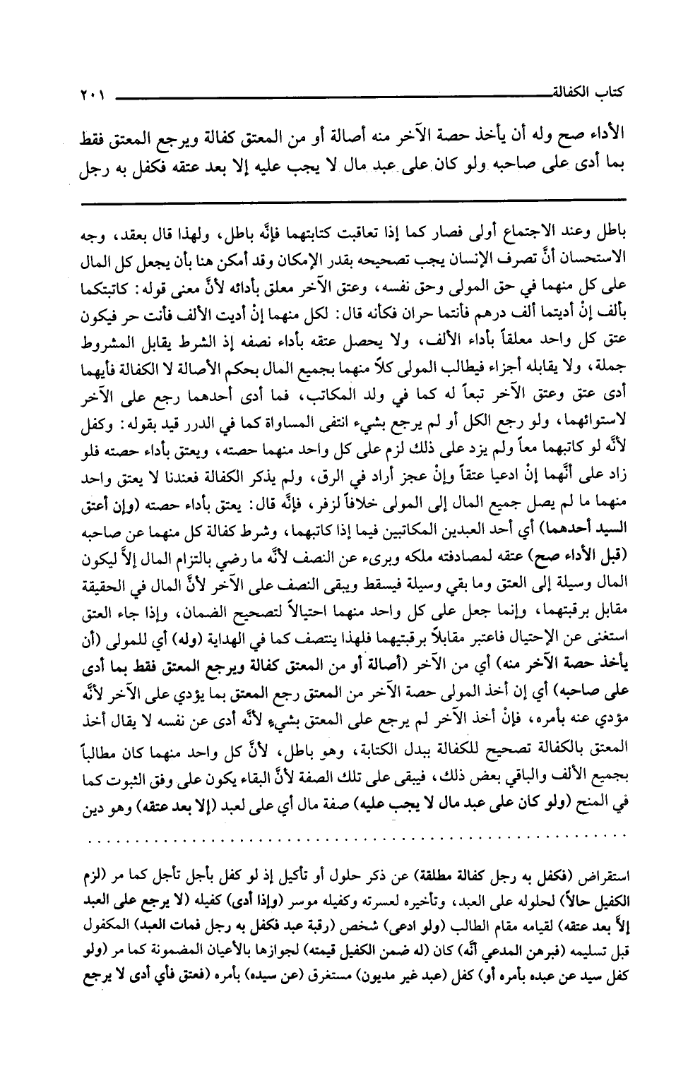 وإن أعتق السيد أحدهما أي أحد العبدين المكاتبين فيما إذا كاتبهما وشرط كفالة كل منهما عن صاحبه قبل الأداء صح عتقه لمصادفته ملكه وبرئ عن النصف لأنه ما رضي بالتزام المال إلا ليكون المال وسيلة إلى العتق وما بقي وسيلة فيسقط ويبقى النصف على الآخر لأن المال في الحقيقة مقابل برقبتيهما وإنما جعل على كل واحد منهما احتيالا لتصحيح الضمان وإذا جاء العتق استغني عن الاحتيال فاعتبر مقابلا برقبتيهما فلهذا ينتصف كما في الهداية وله أي للمولى أن يأخذ حصة الآخر منه أي من الآخر أصالة أو من المعتق كفالة ويرجع المعتق فقط بما أدى على صاحبه أي إن أخذ المولى حصة الآخر من المعتق رجع المعتق بما يؤدي على الآخر لأنه مؤدى عنه بأمره فإن أخذ الآخر لم يرجع على المعتق بشيء لأنه أدى عن نفسه لا يقال أخذ المعتق بالكفالة تصحيح للكفالة ببدل الكتابة وهو باطل لأن كل واحد منهما كان مطالبا بجميع الألف والباقي بعض ذلك فيبقى على تلك الصفة لأن البقاء يكون على وفق الثبوت كما في المنح