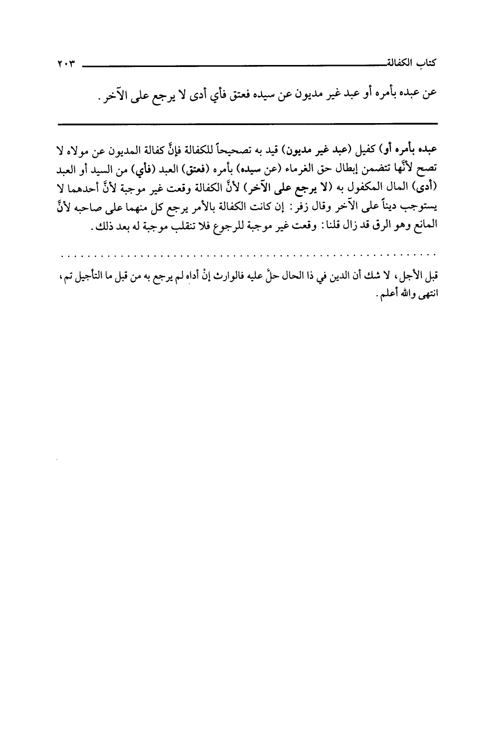 عبده بأمره أو كفل عبد غير مديون قيد به تصحيحا للكفالة فإن كفالة المديون عن مولاه لا تصح لأنها تتضمن إبطال حق الغرماء عن سيده بأمره فعتق العبد فأي من السيد أو العبد أدى المال المكفول به لا يرجع على الآخر لأن الكفالة وقعت غير موجبة لأن أحدهما لا يستوجب دينا على الآخر