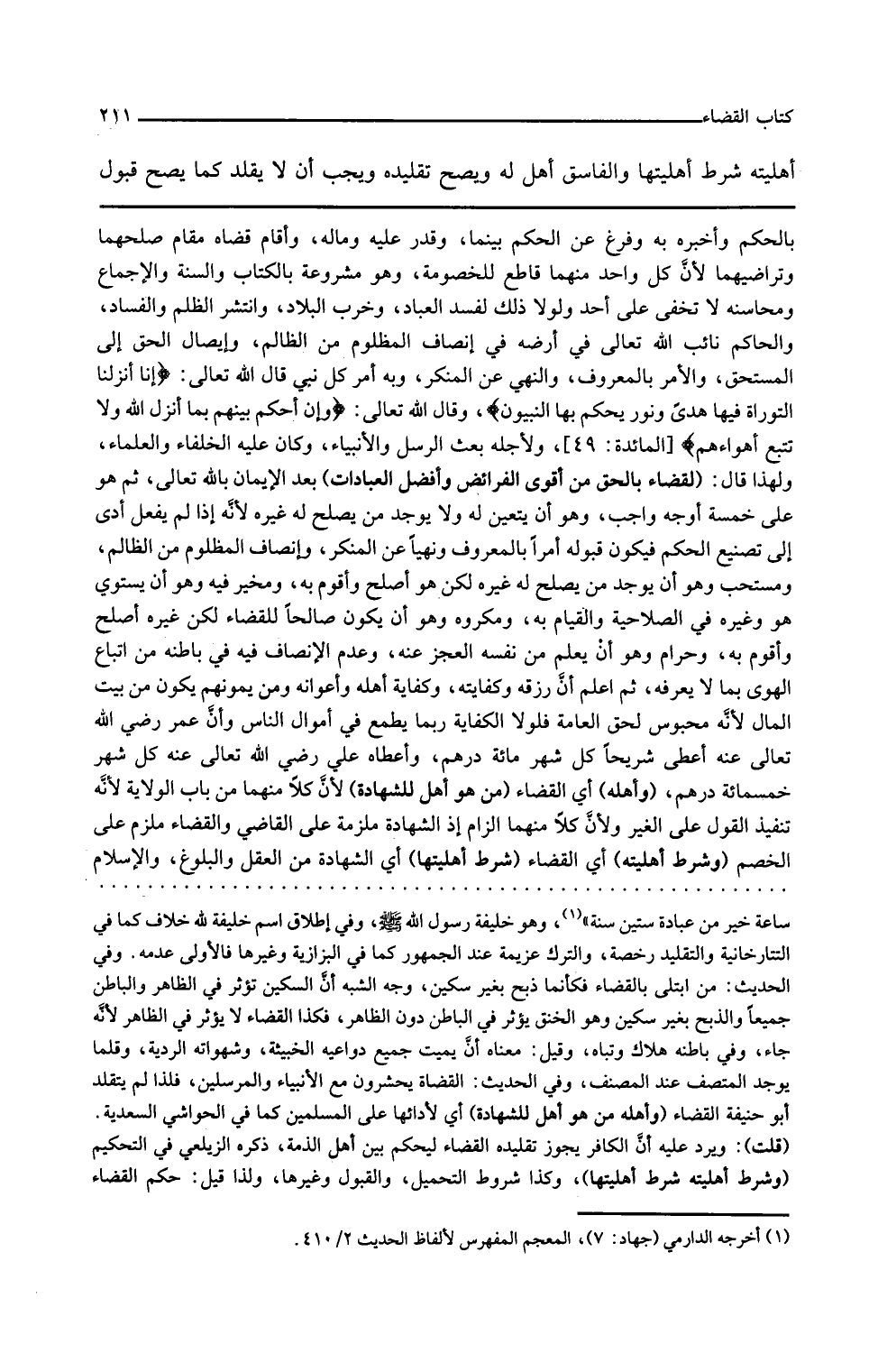 بالحكم وأخبره به وفرغ عن الحكم بينهما وقدر ما عليه وما له وأقام قضاه مقام صلحهما وتراضيهما لأن كل واحد منهما قاطع للخصومة وهو مشروع بالكتاب والسنة والإجماع ومحاسنه لا تخفى على أحد ولولا ذلك لفسد العباد وخرب البلاد وانتشر الظلم والفساد والحاكم نائب الله تعالى في أرضه في إنصاف المظلوم من الظالم وإيصال الحق إلى المستحق والأمر بالمعروف والنهي عن المنكر وبه أمر كل نبي قال الله تعالى إنا أنزلنا التوراة فيها هدى ونور يحكم بها النبيون وقال الله تعالى وأن احكم بينهم بما أنزل الله ولا تتبع أهواءهم ولأجله بعث الرسل والأنبياء وكان عليه الخلفاء والعلماء ولهذا قال القضاء بالحق من أقوى الفرائض وأفضل العبادات بعد الإيمان بالله تعالى ثم هو على خمسة أوجه واجب وهو أن يتعين له ولا يوجد من يصلح له غيره لأنه إذا لم يفعل أدى إلى تضييع الحكم فيكون قبوله أمرا بالمعروف ونهيا عن المنكر وإنصاف المظلوم من الظالم