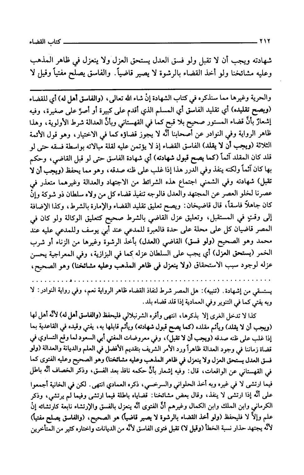 وفي النوادر عن أصحابنا أنه لا يجوز قضاؤه كما في الاختيار وهو قول الأئمة الثلاثة ويجب أن لا يقلد الفاسق القضاء إذ لا يؤتمن عليه لقلة مبالاته بواسطة فسقه حتى لو قلد كان المقلد آثما كما يصح قبول شهادته أي شهادة الفاسق حتى لو قبل القاضي وحكم بها كان آثما ولكنه ينفذ