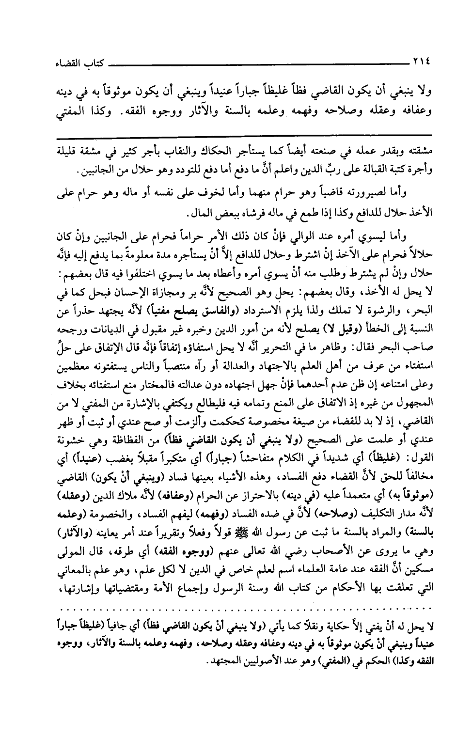 ولا ينبغي أن يكون القاضي فظا من الفظاظة وهي خشونة القول غليظا أي شديدا في الكلام متفاحشا جبارا أي متكبرا مقبلا بغضب عنيدا أي مخالفا للحق لأن القضاء دفع الفساد وهذه الأشياء بعينها فساد وينبغي أن يكون القاضي موثوقا به أي معتمدا عليه في دينه بالاحتراز عن الحرام وعفافه لأنه ملاك الدين وعقله لأنه مدار التكليف وصلاحه لأن في ضده الفساد وفهمه ليفهم الفساد والخصومة وعلمه بالسنة والمراد بالسنة ما ثبت عن رسول الله صلى الله تعالى عليه وسلم قولا وفعلا وتقريرا عند أمر يعاينه والآثار وهي ما يروى عن الأصحاب رضي الله تعالى عنهم ووجوه الفقه أي طرقه قال المولى مسكين إن الفقه عند عامة العلماء اسم لعلم خاص في الدين لا لكل علم وهو علم بالمعاني التي تعلقت بها الأحكام من كتاب الله وسنة الرسول وإجماع الأمة ومقتضياتها وإشارتها