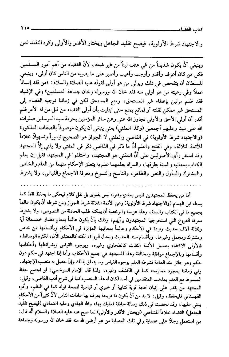 والاجتهاد شرط الأولوية في القاضي والمفتي لا الجواز هو الصحيح تيسيرا وتسهيلا خلافا للأئمة الثلاثة