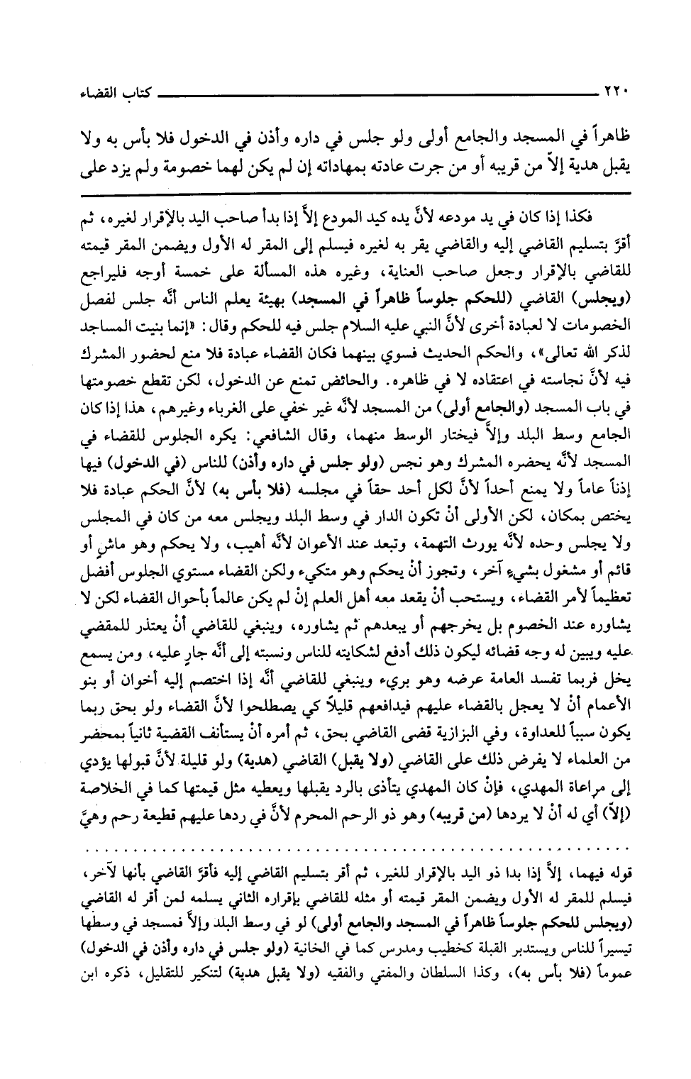 ولو جلس في داره وأذن للناس في الدخول فيها إذنا عاما ولا يمنع أحدا لأن لكل أحد حقا في مجلسه فلا بأس به لأن الحكم عبادة فلا يختص بمكان لكن الأولى أن تكون الدار في وسط البلد ويجلس معه من كان معه في المجلس ولا يجلس وحده لأنه يورث التهمة وتبعد عنه الأعوان لأنه أهيب ولا يحكم وهو ماش أو قائم أو مشغول بشيء آخر وتجوز أن يحكم وهو متكئ ولكن القضاء مستوي الجلوس أفضل تعظيما لأمر القضاء ويستحب أن يقعد معه أهل العلم إن لم يكن عالما بأحوال القضاء لكن لا يشاوره عند الخصوم بل يخرجهم أو يبعدهم ثم يشاوره