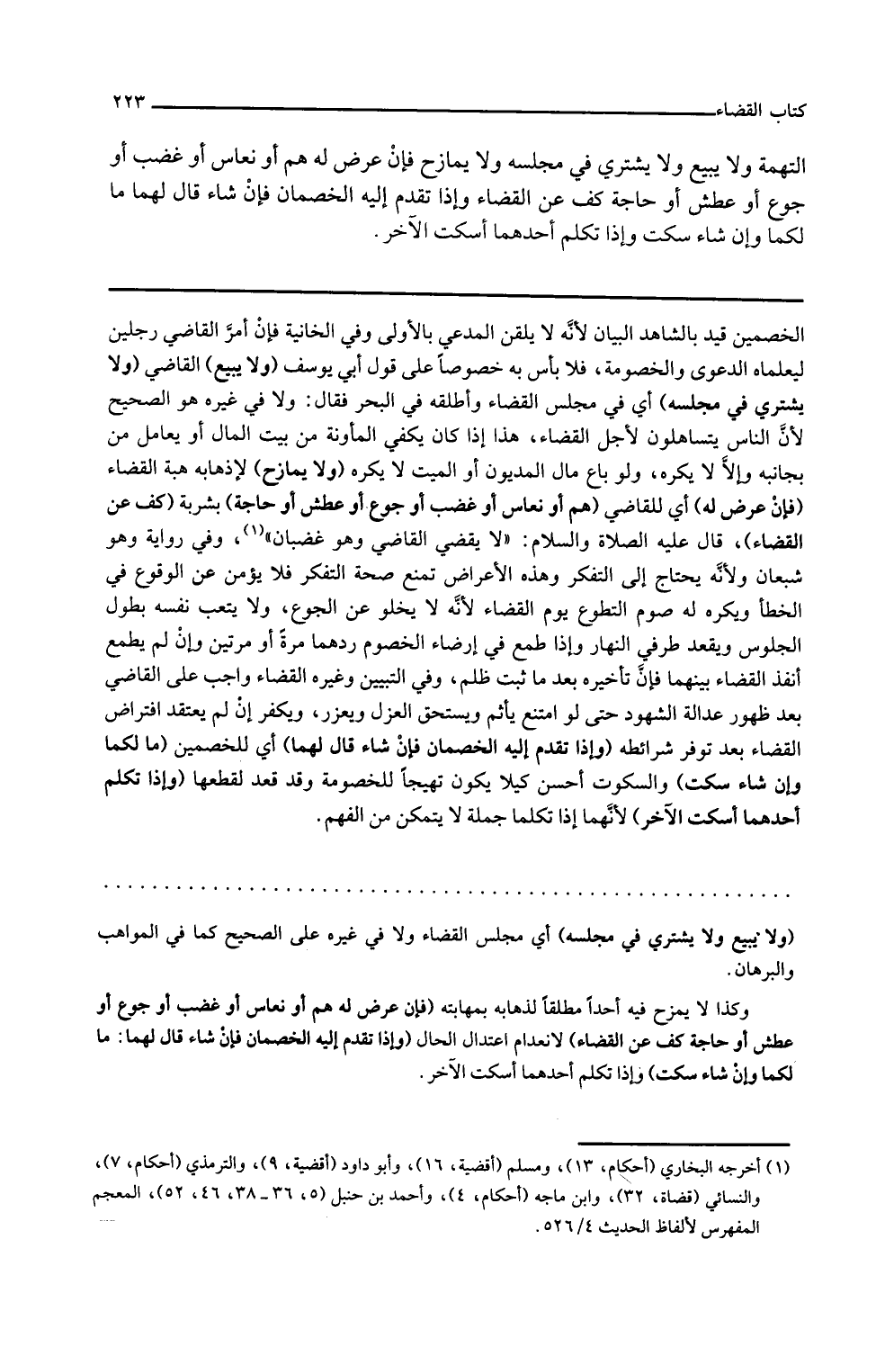 ولا يبيع القاضي ولا يشتري في مجلسه أي في مجلس القضاء وأطلقه في البحر فقال ولا في غيره هو الصحيح لأن الناس يتساهلون لأجل القضاء هذا إذا كان يكفى المئونة من بيت المال أو يعامل من بجانبه وإلا لا يكره ولو باع مال المديون أو الميت لا يكره ولا يمازح لإذهابه هيبة القضاء فإن عرض له أي للقاضي هم أو نعاس أو غضب أو جوع أو عطش أو حاجة بشربة كف عن القضاء قال عليه الصلاة والسلام لا يقضي القاضي وهو غضبان