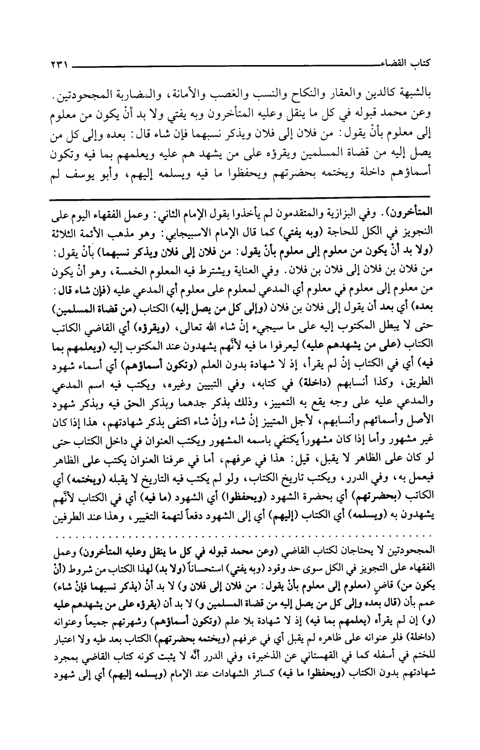 وفي العناية ويشترط فيه المعلوم الخمسة وهو أن يكون من معلوم إلى معلوم في معلوم أي المدعى لمعلوم على معلوم أي المدعى عليه فإن شاء قال بعده أي بعد أن يقول إلى فلان بن فلان وإلى كل من يصل إليه الكتاب من قضاة المسلمين حتى لا يبطل المكتوب إليه على ما سيجيء إن شاء الله تعالى ويقرؤه أي القاضي الكاتب الكتاب على من يشهدهم عليه ليعرفوا ما فيه لأنهم يشهدون عند المكتوب إليه ويعلمهم بما فيه أي في الكتاب إن لم يقرأ إذ لا شهادة بدون العلم وتكون أسماؤهم أي أسماء شهود الطريق وكذا أنسابهم داخلة في كتابه