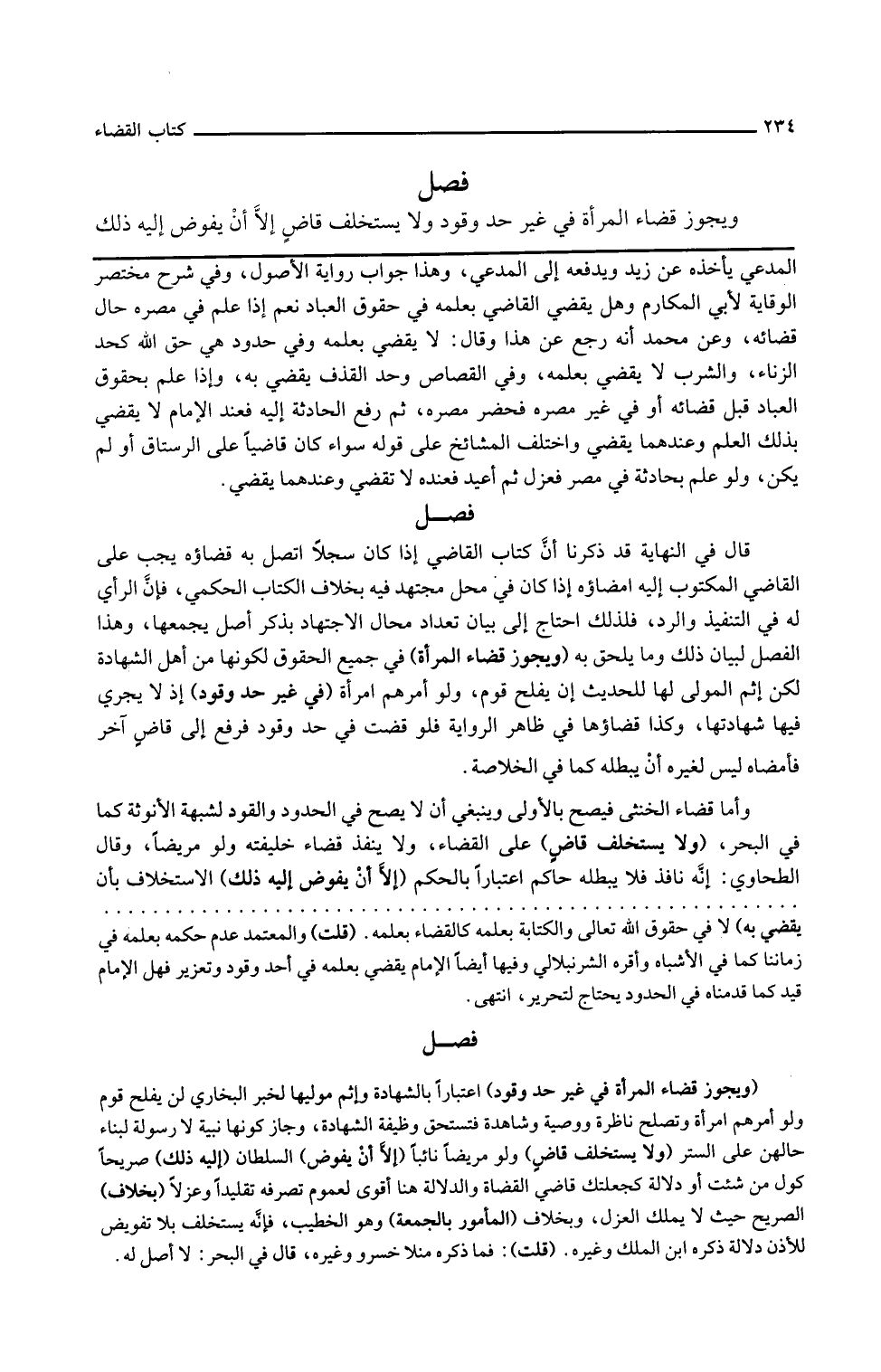 ويجوز قضاء المرأة في جميع الحقوق لكونها من أهل الشهادة لكن أثم المولي لها للحديث لن يفلح قوم ولوا أمرهم امرأة في غير حد وقود إذ لا يجري فيها شهادتها وكذا قضاؤها في ظاهر الرواية فلو قضت في حد وقود فرفع إلى قاض آخر فأمضاه ليس لغيره أن يبطله كما في الخلاصة وأما قضاء الخنثى فيصح بالأولى وينبغي أن لا يصح في الحدود والقود لشبهة الأنوثة كما في البحر