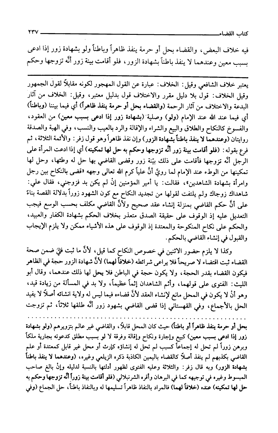 والقضاء بحل أو حرمة ينفذ ظاهرا أي فيما بيننا وباطنا أي فيما عند الله عند الإمام ولو وصلية بشهادة زور إذا ادعي بسبب معين من العقود والفسوخ كالنكاح والطلاق والبيع والشراء والإقالة والرد بالعيب والنسب وفي الهبة والصدقة روايتان وعندهما لا ينفذ باطنا بشهادة الزور وإن نفذ ظاهرا وهو قول زفر والأئمة الثلاثة ثم فرع بقوله فلو أقامت بينة زور أنه تزوجها وحكم به حل لها تمكينه أي إذا ادعت المرأة على الرجل أنه تزوجها فأقامت على ذلك بينة زور وقضى القاضي بها حل له وطؤها وحل لها تمكينه من الوطء عند الإمام لما روي أن عليا كرم الله تعالى وجهه قضى بالنكاح بين رجل وامرأة بشهادة الشاهدين فقالت يا أمير المؤمنين إن لم يكن بد فزوجني فقال علي شاهداك زوجاك ولم يلتفت لقولها من تجديد النكاح مع كون الشهود زورا بدلالة القصة بناء على أن حكم القاضي بمنزلة إنشاء عقد صحيح ولأن القاضي مكلف بحسب الوسع فيجب التعديل عليه إذ الوقوف على حقيقة الصدق متعذر بخلاف الحكم بشهادة الكفار والعبيد والحكم على نكاح المنكوحة والمعتدة إذ الوقوف على هذه الأشياء ممكن ولا يلزم الإيجاب والقبول في إنشاء القاضي بالحكم وكذا لا يلزم حضور الاثنين في خصوص النكاح كما قيل لأن ما ثبت في ضمن صحة القضاء ثبت اقتضاء لا صريحا فلا تراعى شرائطه خلافا لهما لأن شهادة الزور حجة في الظاهر فيكون القضاء بقدر الحجة ولا يكون حجة في الباطن فلا يحل لها ذلك عندهما