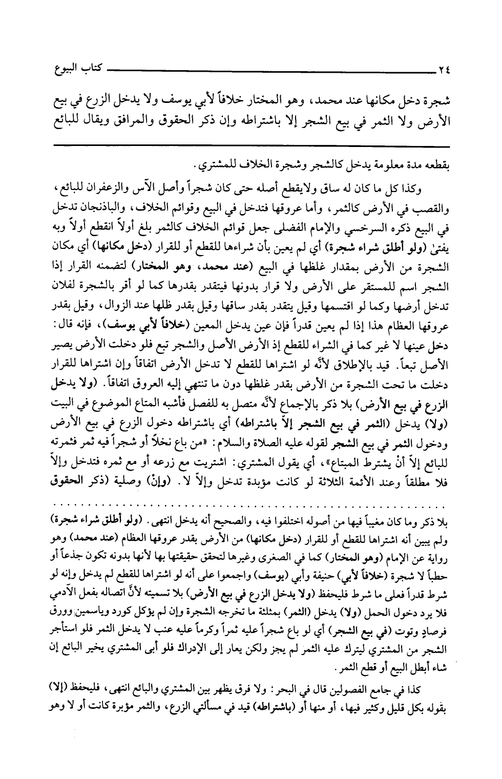 ولا يدخل الثمر في بيع الشجر إلا باشتراطه أي باشتراط دخول الزرع في بيع الأرض ودخول الثمر في بيع الشجر لقوله عليه الصلاة والسلام من باع نخلا أو شجرا فيه ثمر فثمرته للبائع إلا أن يشترط المبتاع أي يقول المشتري اشتريت مع زرعه أو مع ثمره فتدخل وإلا فلا مطلقا وعند الأئمة الثلاثة لو كانت مؤبدة تدخل وإلا لا