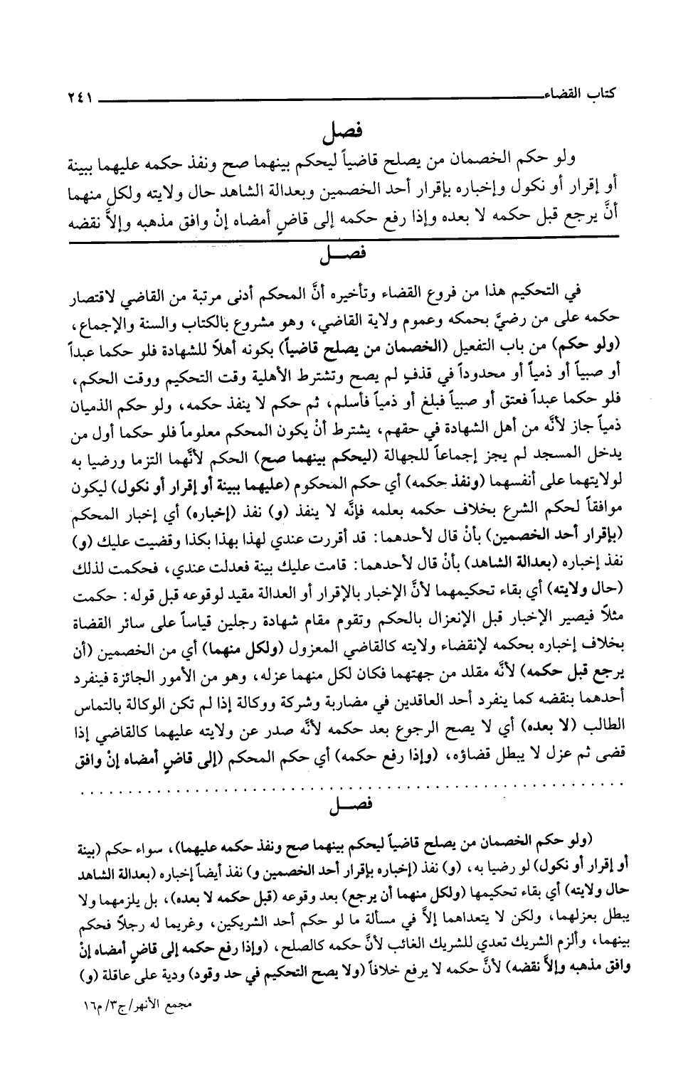 ولو حكم من باب التفعيل الخصمان من يصلح قاضيا بكونه أهلا للشهادة فلو حكما عبدا أو صبيا أو ذميا أو محدودا في قذف لم يصح وتشترط الأهلية وقت التحكيم ووقت الحكم فلو حكما عبدا فعتق أو صبيا فبلغ أو ذميا فأسلم ثم حكم لا ينفذ حكمه ولو حكم الذميان ذميا جاز لأنه من أهل الشهادة في حقهم ويشترط أن يكون المحكم معلوما فلو حكما أول من يدخل المسجد لم يجز إجماعا للجهالة ليحكم بينهما صح الحكم لأنهما التزما ورضيا به لولايتهما على أنفسهما ونفذ حكمه أي حكم المحكوم عليهما ببينة أو إقرار أو نكول ليكون موافقا لحكم الشرع بخلاف حكمه بعلمه فإنه لا ينفذ