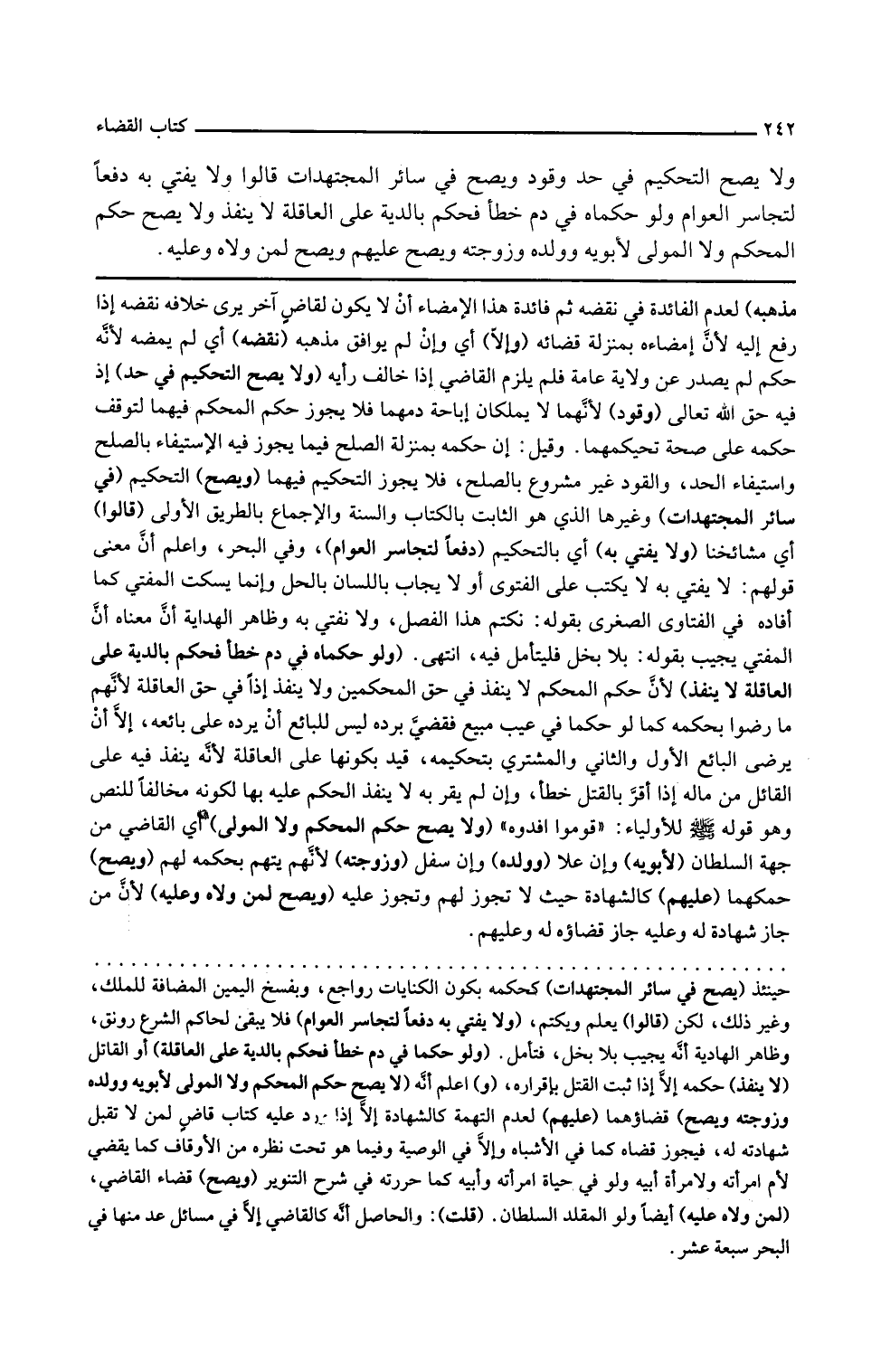 ولا يصح التحكيم في حد إذ فيه حق الله تعالى وقود لأنهما لا يملكان إباحة دمهما فلا يجوز حكم المحكم فيهما لتوقف حكمه على صحة تحكيمهما وقيل إن حكمه بمنزلة الصلح فيما يجوز فيه الاستيفاء بالصلح واستيفاء الحد والقود غير مشروع بالصلح فلا يجوز التحكيم فيهما ويصح التحكيم في سائر المجتهدات وغيرها الذي هو الثابت بالكتاب والسنة والإجماع بالطريق الأولى قالوا أي مشايخنا ولا يفتى به أي بالتحكيم دفعا لتجاسر العوام